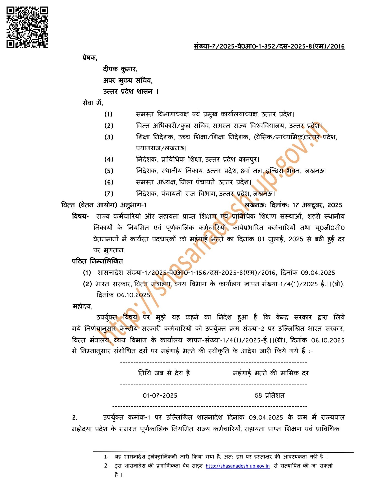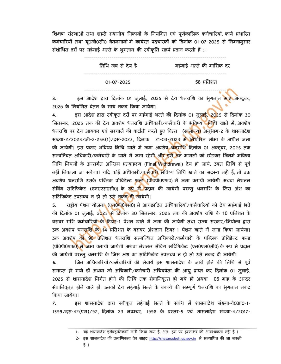 01 जुलाई से DA 58% एवं अक्टूबर के वेतन से नियमित भुगतान करने का आदेश जारी।