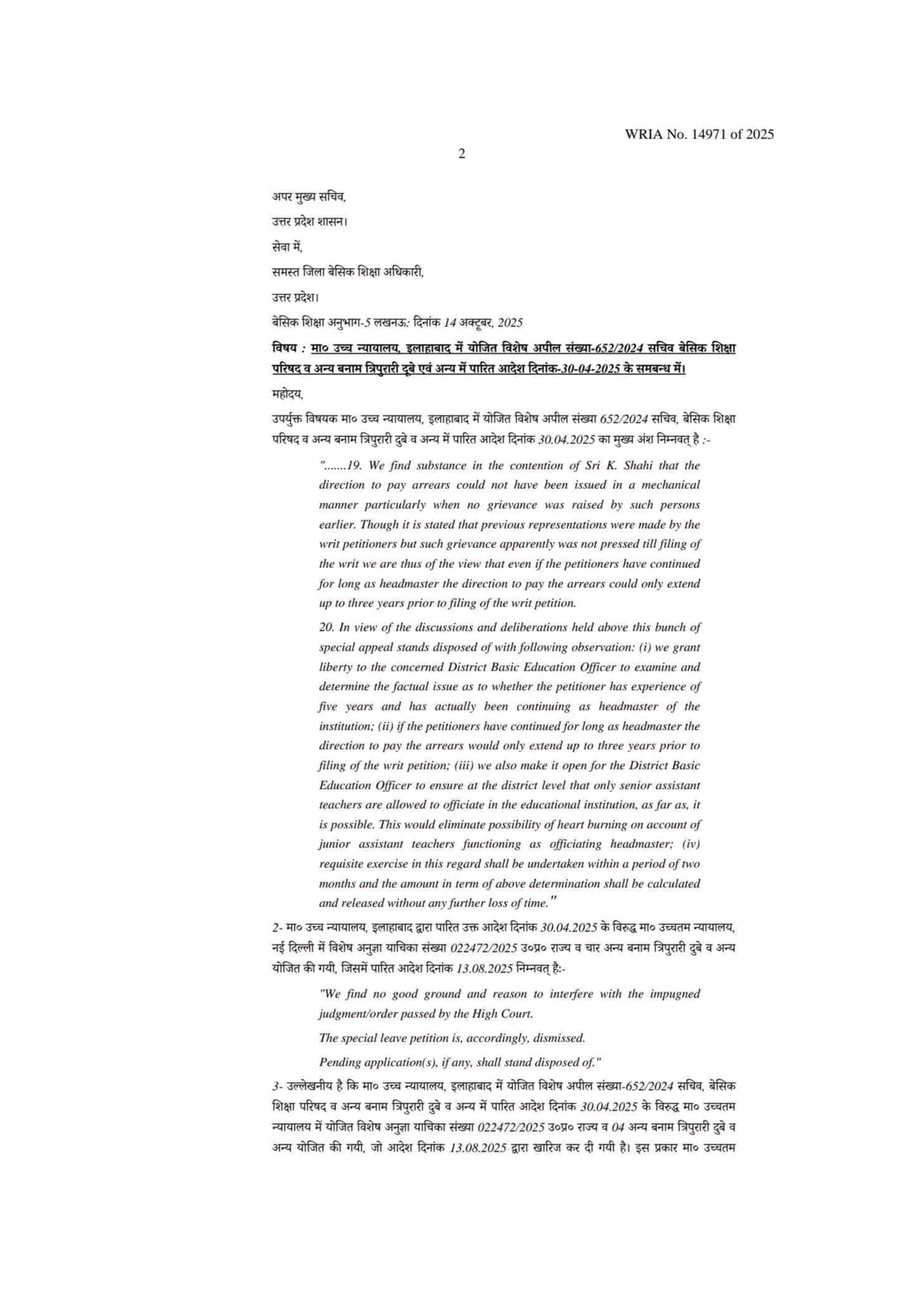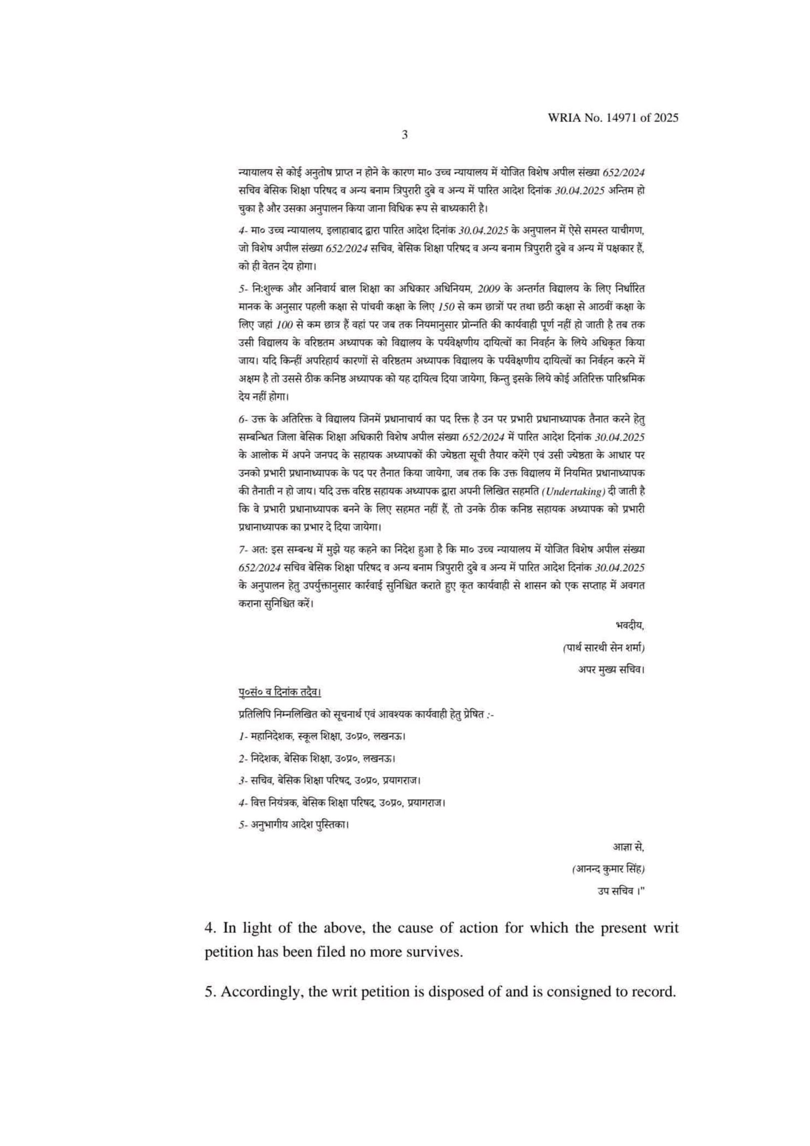 कोर्ट आदेश के क्रम में ही जनपदीय वरिष्ठता सूची से इंचार्ज बनाने की प्रक्रिया विभाग द्वारा प्रारंभ की गई है।इसलिए केस खारिज हुआ है।पहले सीनियर इंचार्ज बन जाए फिर विभाग से अतिरिक्त वेतन की मांग करे तब यदि विभाग भुगतान न करे तो फिर कोर्ट आ सकते है।