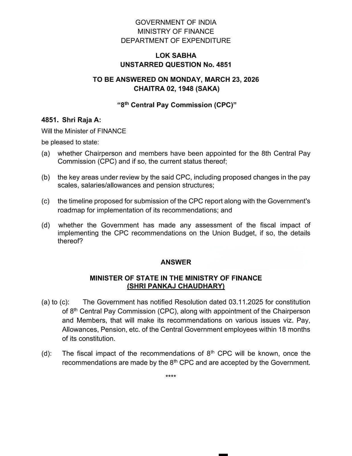 यह दस्तावेज़ भारत सरकार के वित्त मंत्रालय द्वारा लोकसभा में 8वें वेतन आयोग (CPC) से जुड़े प्रश्न का आधिकारिक जवाब है। इसमें बताया गया है कि सरकार ने 3 नवंबर 2025 को 8वें केंद्रीय वेतन आयोग के गठन की अधिसूचना जारी कर दी है और इसके अध्यक्ष व सदस्यों की नियुक्ति भी की जा चुकी है। यह आयोग केंद्र सरकार के कर्मचारियों के वेतन, भत्तों और पेंशन से जुड़े सभी महत्वपूर्ण मुद्दों की समीक्षा करेगा। साथ ही आयोग को अपनी रिपोर्ट तैयार करने के लिए गठन की तारीख से 18 महीने का समय दिया गया है, यानी यह अपनी सिफारिशें तय समय सीमा के भीतर सरकार को सौंपेगा। इसके अलावा, सरकार ने यह भी स्पष्ट किया है कि वेतन आयोग की सिफारिशों का बजट पर कितना असर पड़ेगा, इसका सही अनुमान तभी लगाया जा सकेगा जब आयोग अपनी अंतिम रिपोर्ट दे देगा और सरकार उसे स्वीकार कर लेगी। कुल मिलाकर, प्रक्रिया जारी है और अंतिम निर्णय रिपोर्ट आने के बाद ही लिया जाएगा।