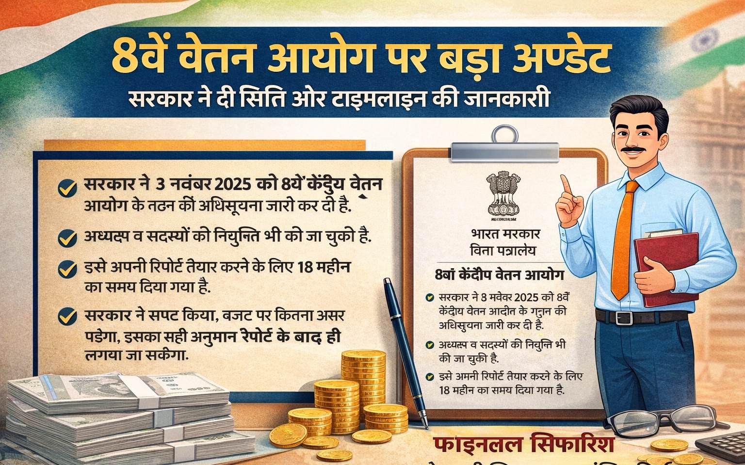 8वें वेतन आयोग को लेकर केंद्र सरकार ने स्थिति अब काफी हद तक स्पष्ट कर दी है, जिससे कर्मचारियों और पेंशनर्स के बीच चल रही असमंजस की स्थिति खत्म होती दिख रही है। सरकार के अनुसार आयोग फिलहाल सुझाव और आंकड़ों के विश्लेषण के चरण में है, यानी अभी अंतिम सिफारिशें तैयार नहीं हुई हैं। जानकारी के मुताबिक इस आयोग का गठन नवंबर 2025 में किया गया था और इसे अपनी रिपोर्ट देने के लिए करीब 18 महीने का समय दिया गया है, इसलिए उम्मीद की जा रही है कि इसकी रिपोर्ट 2027 के मध्य तक आ सकती है। हालांकि सैलरी और पेंशन में संशोधन का प्रभाव 1 जनवरी 2026 से लागू माना जाएगा, भले ही कर्मचारियों को इसका लाभ बाद में मिले। इसका मतलब साफ है कि जब भी नई सैलरी लागू होगी, तब तक का एरियर भी एक साथ दिया जा सकता है। सैलरी बढ़ोतरी को लेकर अभी कोई आधिकारिक आंकड़ा सामने नहीं आया है, लेकिन विशेषज्ञों के अनुसार इसमें 20 से 35 प्रतिशत तक वृद्धि संभव मानी जा रही है, जो फिटमेंट फैक्टर पर निर्भर करेगी। कुल मिलाकर, अभी प्रक्रिया जारी है और अंतिम फैसला रिपोर्ट आने के बाद ही लिया जाएगा, लेकिन इतना तय है कि कर्मचारियों को आने वाले समय में इसका अच्छा फायदा मिल सकता है।