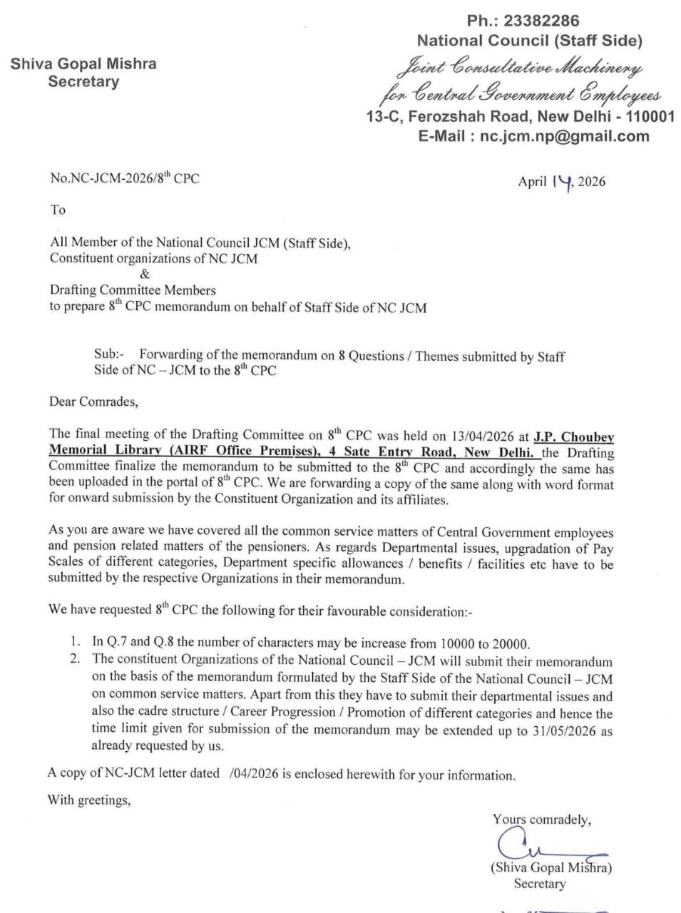 केंद्र सरकार के कर्मचारियों के लिए बड़ी खबर सामने आई है। National Council (Joint Consultative Machinery) (स्टाफ साइड) ने 8th Central Pay Commission को 51 पन्नों का विस्तृत ज्ञापन सौंपा है। इसमें वेतन संरचना में बड़े बदलावों का प्रस्ताव रखा गया है।