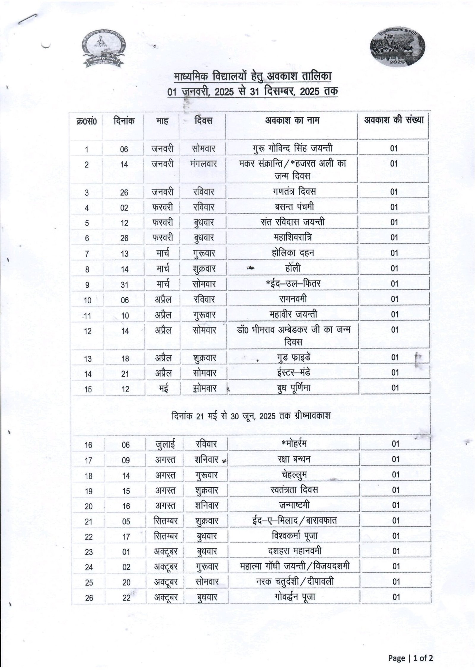 प्रदेश के माध्यमिक विद्यालयों के लिये वर्ष 2025 की अवकाश तालिका जारी, देखें