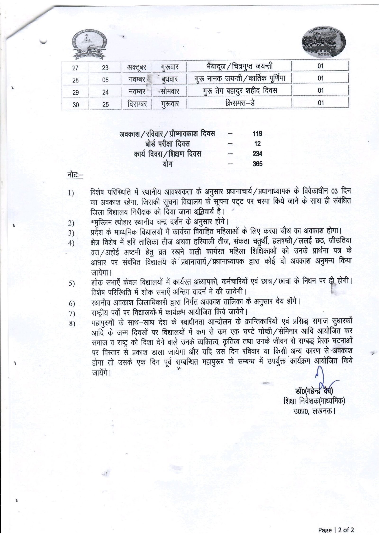 अतः अपने जनपद के स्थानीय अवकाशों को यथावश्यक समायोजित करते हुए माध्यमिक विद्यालयों की अवकाश तालिका अपने स्तर से अधीनस्थ विद्यालयों के प्रधानाचार्यों/प्रधानाध्यापकों को प्रेषित करना सुनिश्चित करें