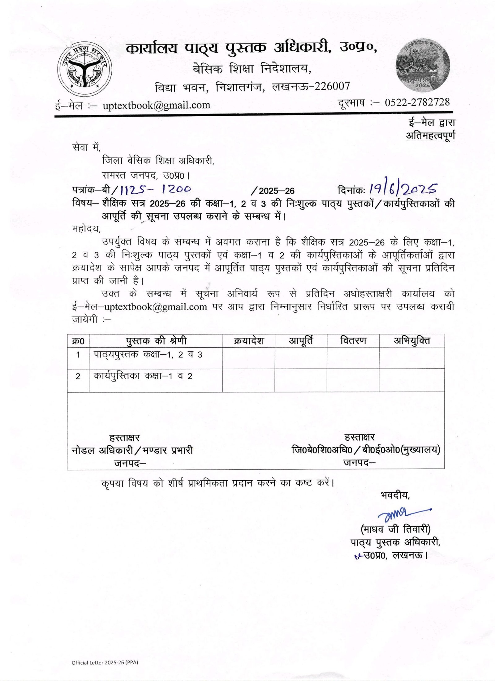 शैक्षिक सत्र 2025-26 की कक्षा-1, 2 व 3 की निःशुल्क पाठ्य पुस्तकों/कार्यपुस्तिकाओं की आपूर्ति की सूचना उपलब्ध कराने के सम्बन्ध में।