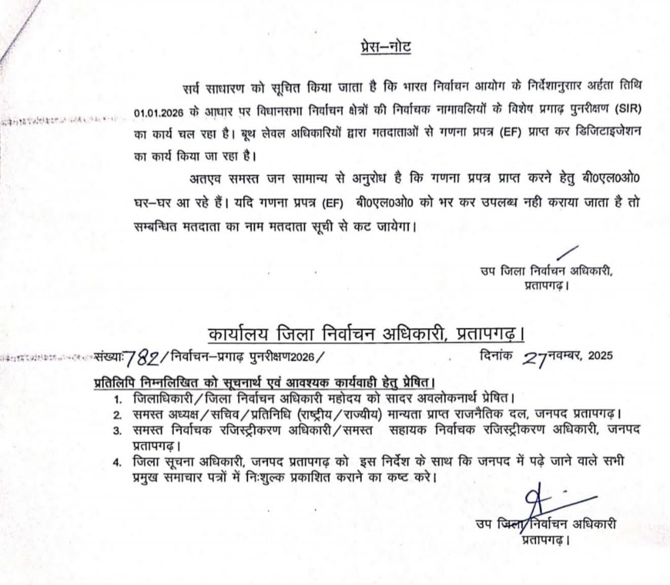 рд╕рд░реНрд╡ рд╕рд╛рдзрд╛рд░рдг рдХреЛ рд╕реВрдЪрд┐рдд рдХрд┐рдпрд╛ рдЬрд╛рддрд╛ рд╣реИ рдХрд┐ рднрд╛рд░рдд рдирд┐рд░реНрд╡рд╛рдЪрди рдЖрдпреЛрдЧ рдХреЗ рдирд┐рд░реНрджреЗрд╢рд╛рдиреБрд╕рд╛рд░ рдЕрд░реНрд╣рддрд╛ рддрд┐рдерд┐ 01.01.2026 рдХреЗ рдЖрдзрд╛рд░ рдкрд░ рд╡рд┐рдзрд╛рдирд╕рднрд╛ рдирд┐рд░реНрд╡рд╛рдЪрди рдХреНрд╖реЗрддреНрд░реЛрдВ рдХреА рдирд┐рд░реНрд╡рд╛рдЪрдХ рдирд╛рдорд╛рд╡рд▓рд┐рдпреЛрдВ рдХреЗ рд╡рд┐рд╢реЗрд╖ рдкреНрд░рдЧрд╛рдврд╝ рдкреБрдирд░реАрдХреНрд╖рдг (SIR) рдХрд╛ рдХрд╛рд░реНрдп рдЪрд▓ рд░рд╣рд╛ рд╣реИред рдмреВрде рд▓реЗрд╡рд▓ рдЕрдзрд┐рдХрд╛рд░рд┐рдпреЛрдВ рджреНрд╡рд╛рд░рд╛ рдорддрджрд╛рддрд╛рдУрдВ рд╕реЗ рдЧрдгрдирд╛ рдкреНрд░рдкрддреНрд░ (EF) рдкреНрд░рд╛рдкреНрдд рдХрд░ рдбрд┐рдЬрд┐рдЯрд╛рдЗрдЬреЗрд╢рди рдХрд╛ рдХрд╛рд░реНрдп рдХрд┐рдпрд╛ рдЬрд╛ рд░рд╣рд╛ рд╣реИред