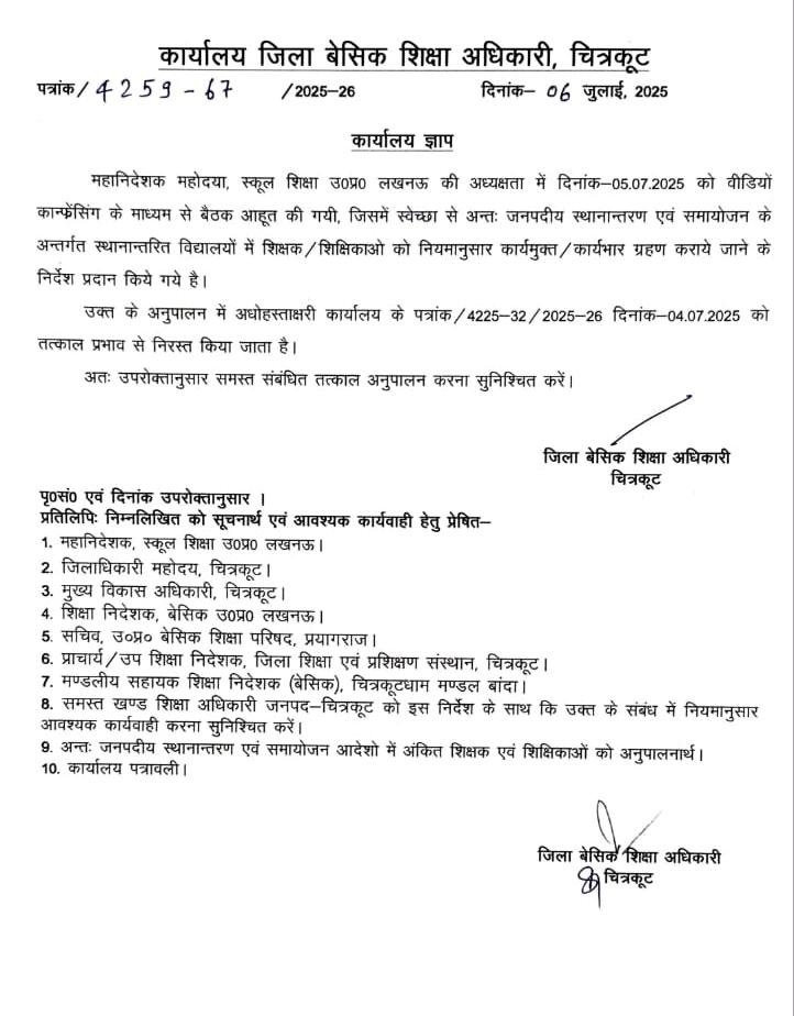 महानिदेशक महोदया, स्कूल शिक्षा उ०प्र० लखनऊ की अध्यक्षता में दिनांक-05.07.2025 को वीडियों कान्फ्रेंसिंग के माध्यम से बैठक आहूत की गयी, जिसमें स्वेच्छा से अन्तः जनपदीय स्थानान्तरण एवं समायोजन के अन्तर्गत स्थानान्तरित विद्यालयों में शिक्षक / शिक्षिकाओ को नियमानुसार कार्यमुक्त / कार्यभार ग्रहण कराये जाने के निर्देश प्रदान किये गये है।