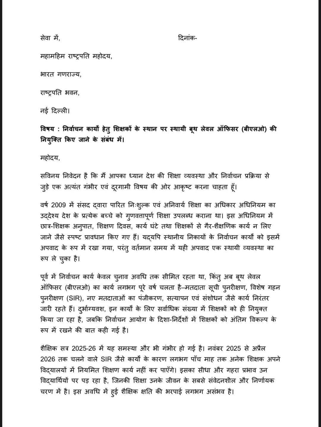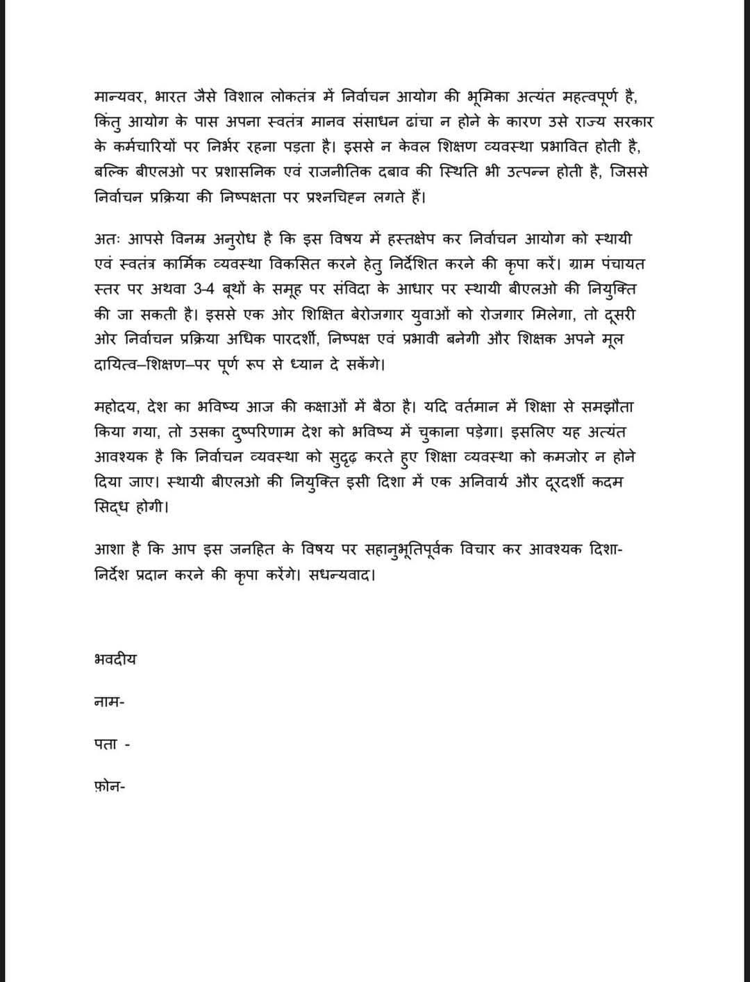 इसी विषय पर स्थायी BLO की नियुक्ति की माँग को लेकर एक पत्र तैयार किया गया है। यह पत्र