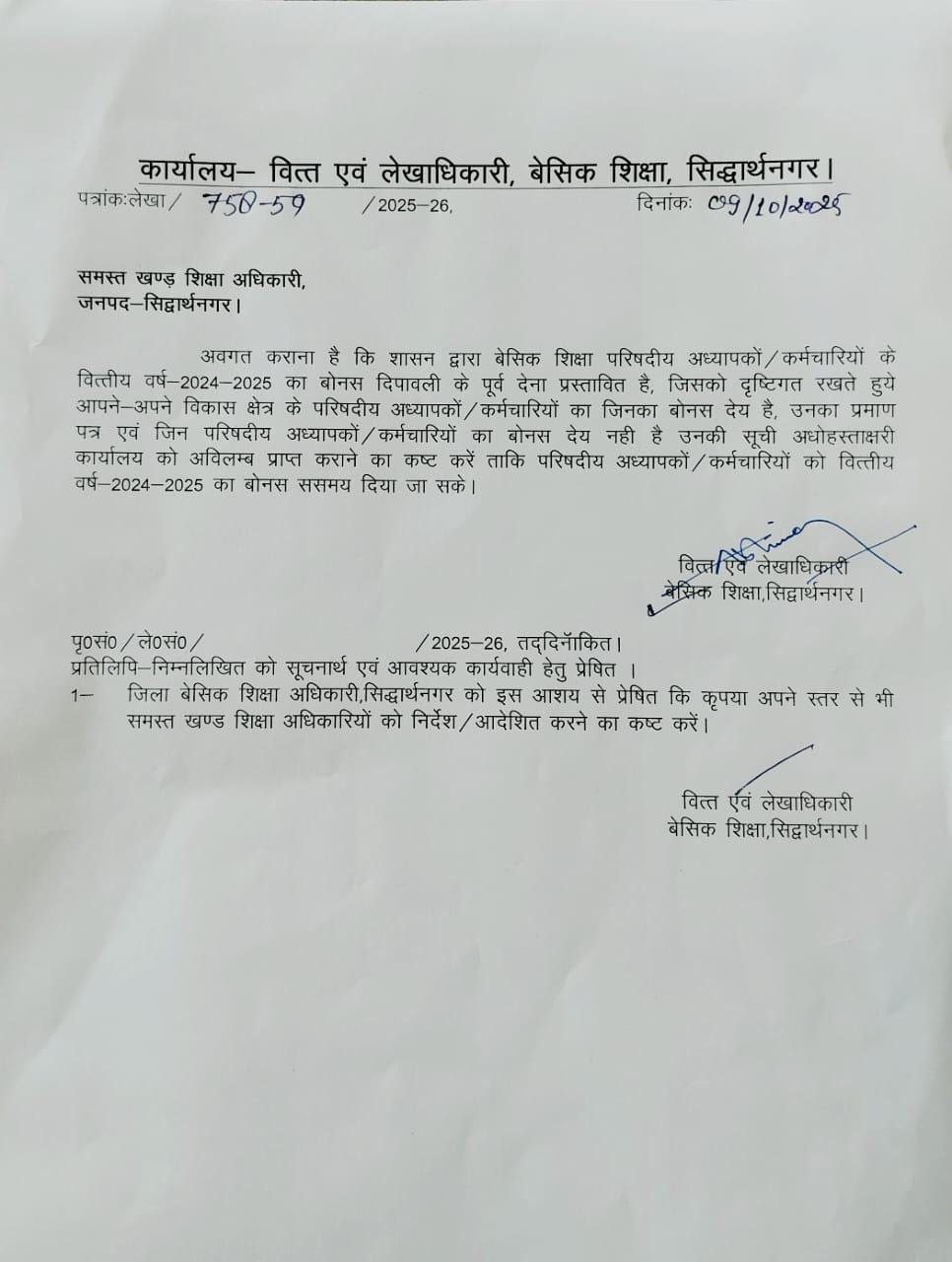 अवगत कराना है कि शासन द्वारा बेसिक शिक्षा परिषदीय अध्यापको/कर्मचारियों के वित्तीय वर्ष-2024-2026 का बोनस दिपावली के पूर्व देना प्रस्तावित है, जिसको दृष्टिगत रखते हुये आपने-अपने विकास क्षेत्र के परिषदीय अध्यापकों/कर्मचारियों का जिनका बोनस देय है,