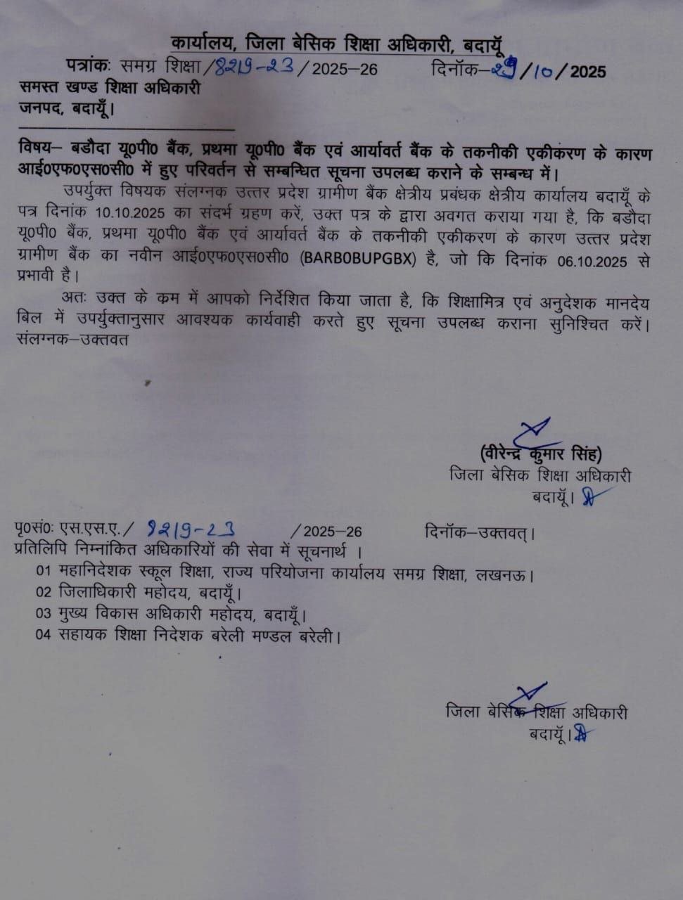 कि बडौदा यू०पी० बैंक, प्रथमा यू०पी० बैंक एवं आर्यावर्त बैंक के तकनीकी एकीकरण के कारण उत्तर प्रदेश ग्रामीण बैंक का नवीन आई०एफ००एस०सी० (BARB0BUPGBX) है, जो कि दिनांक 06.10.2025 से प्रभावी है। अतः उक्त के कम में आपको निर्देशित किया जाता है, कि शिक्षामित्र एवं अनुदेशक मानदेय बिल में उपर्युक्तानुसार आवश्यक कार्यवाही करते हुए सूचना उपलब्ध कराना सुनिश्चित करें। संलग्नक उक्तवत