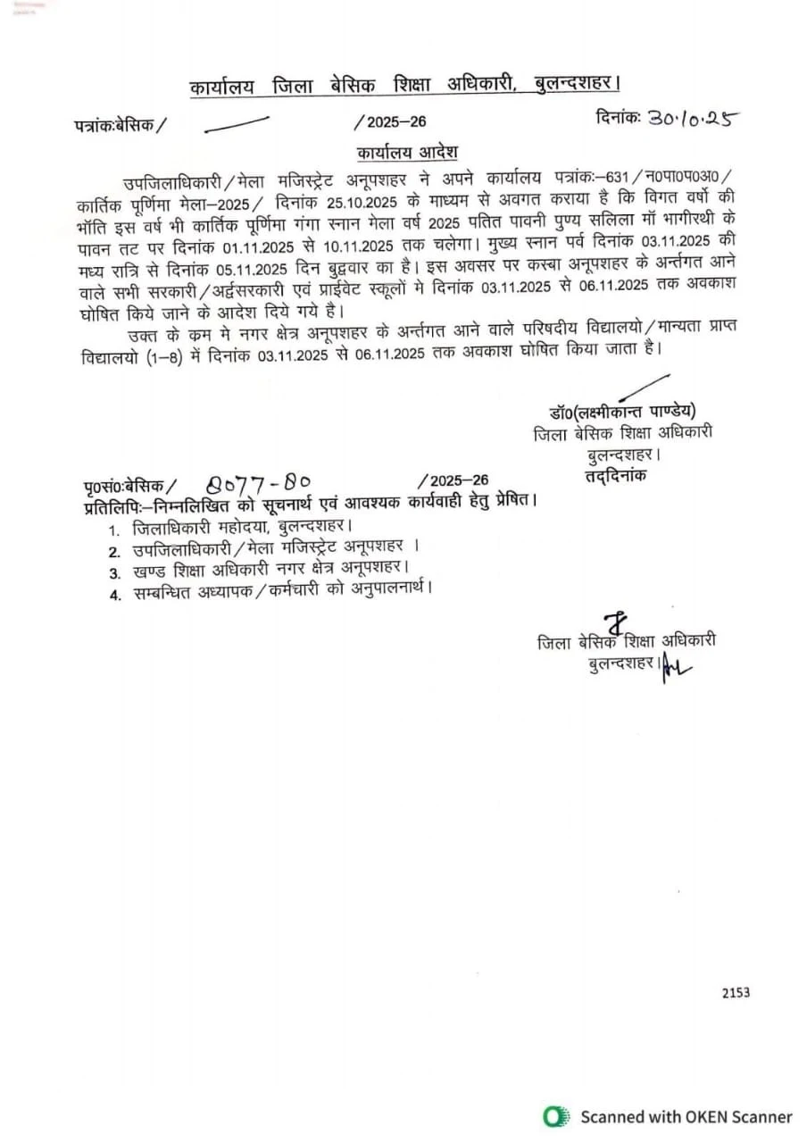 उक्त के कम मे नगर क्षेत्र अनूपशहर के अन्र्तगत आने वाले परिषदीय विद्यालयो / मान्यता प्राप्त विद्यालयो (1-8) में दिनांक 03.11.2025 से 06.11.2025 तक अवकाश घोषित किया जाता है।