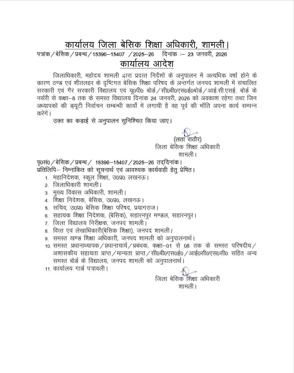 शामली। : जिले में ठंड और शीतलहर के चलते 24 जनवरी 2026 को नर्सरी से कक्षा 8 तक के सभी स्कूल बंद रहेंगे। जिला बेसिक शिक्षा अधिकारी शामली द्वारा जारी आदेश के अनुसार बेसिक शिक्षा परिषद के अंतर्गत संचालित सभी सरकारी, गैर सरकारी, सहायता प्राप्त, मान्यता प्राप्त तथा यूपी बोर्ड, सीबीएसई और आईसीएसई बोर्ड से संबद्ध विद्यालयों में अवकाश रहेगा।