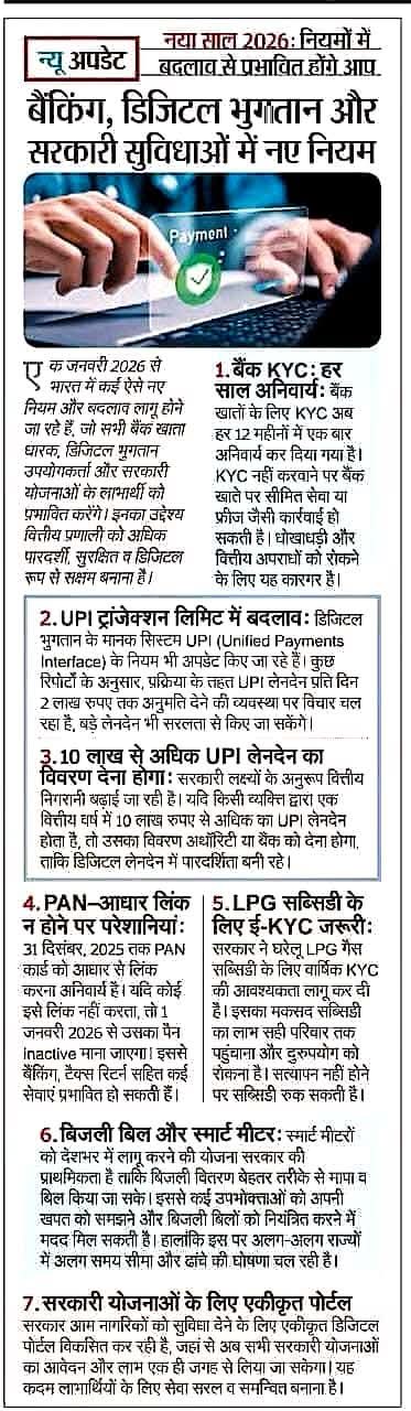 बैंकिंग, डिजिटल भुगतान और सरकारी सुविधाओं के नये नियम… December 31, 2025 by Ravi Singh बैंकिंग, डिजिटल भुगतान और सरकारी सुविधाओं के नये नियम… बैंकिंग, डिजिटल भुगतान और सरकारी सुविधाओं के नये नियम…👆