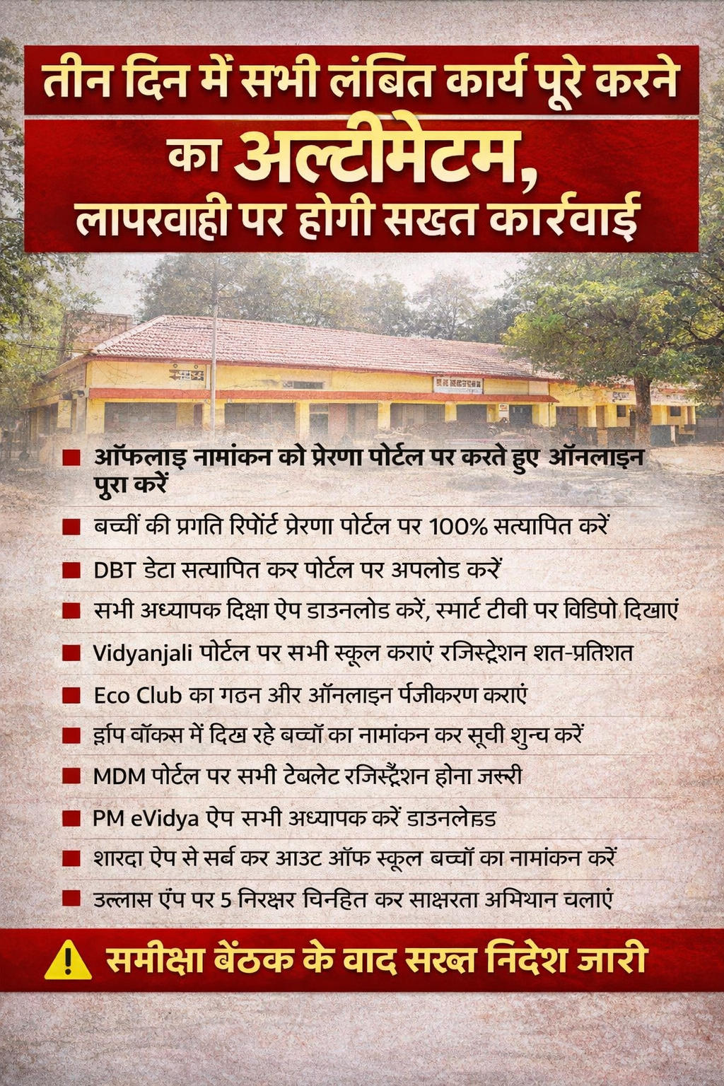 तीन दिन में पेंडेंसी खत्म करने का अल्टीमेटम, स्कूलों को सख्त निर्देश जारी