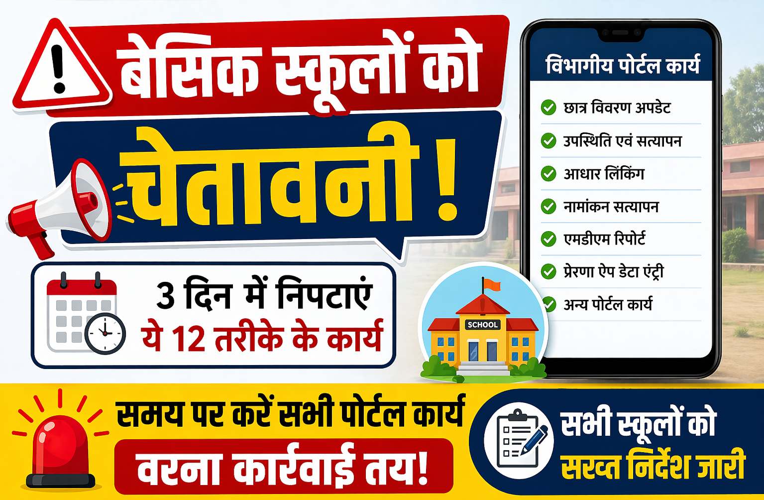 बेसिक स्कूलों को सख्त चेतावनी! 3 दिन में निपटाएं 12 विभागीय काम, नहीं तो होगी कार्रवाई