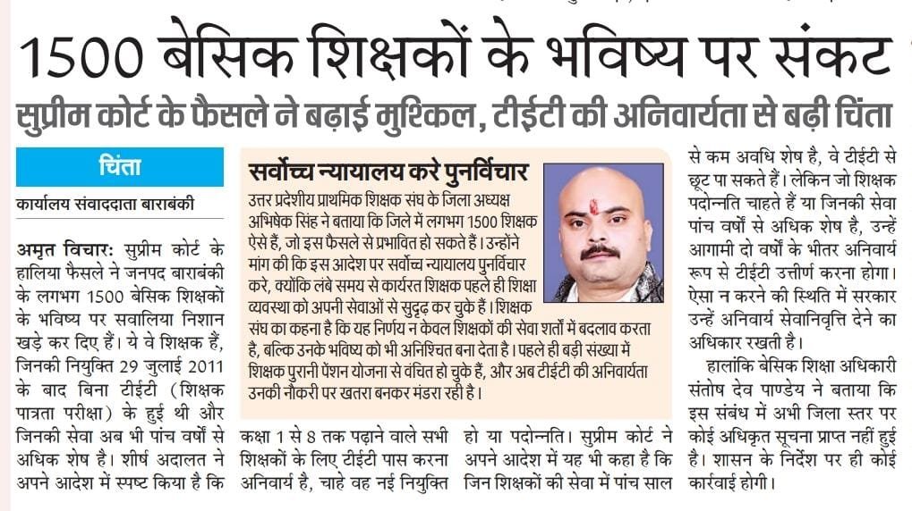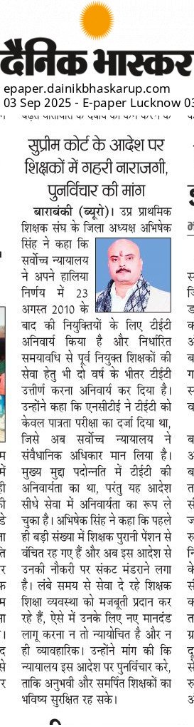 बेसिक शिक्षकों के भविष्य पर संकट: सुप्रीम कोर्ट के फैसले ने बढ़ाई मुश्किल, टीईटी की अनिवार्यता से बढ़ी चिंता September 3, 2025 by Jaswant Singh बेसिक शिक्षकों के भविष्य पर संकट: सुप्रीम कोर्ट के फैसले ने बढ़ाई मुश्किल, टीईटी की अनिवार्यता से बढ़ी चिंता