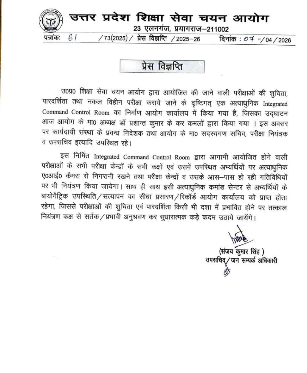 यूपी शिक्षा सेवा चयन आयोग का सख्त फैसला — अब हाई-टेक ‘Integrated Command Control Room’ से होगी परीक्षाओं की निगरानी, नकल पर पूरी तरह रोक!