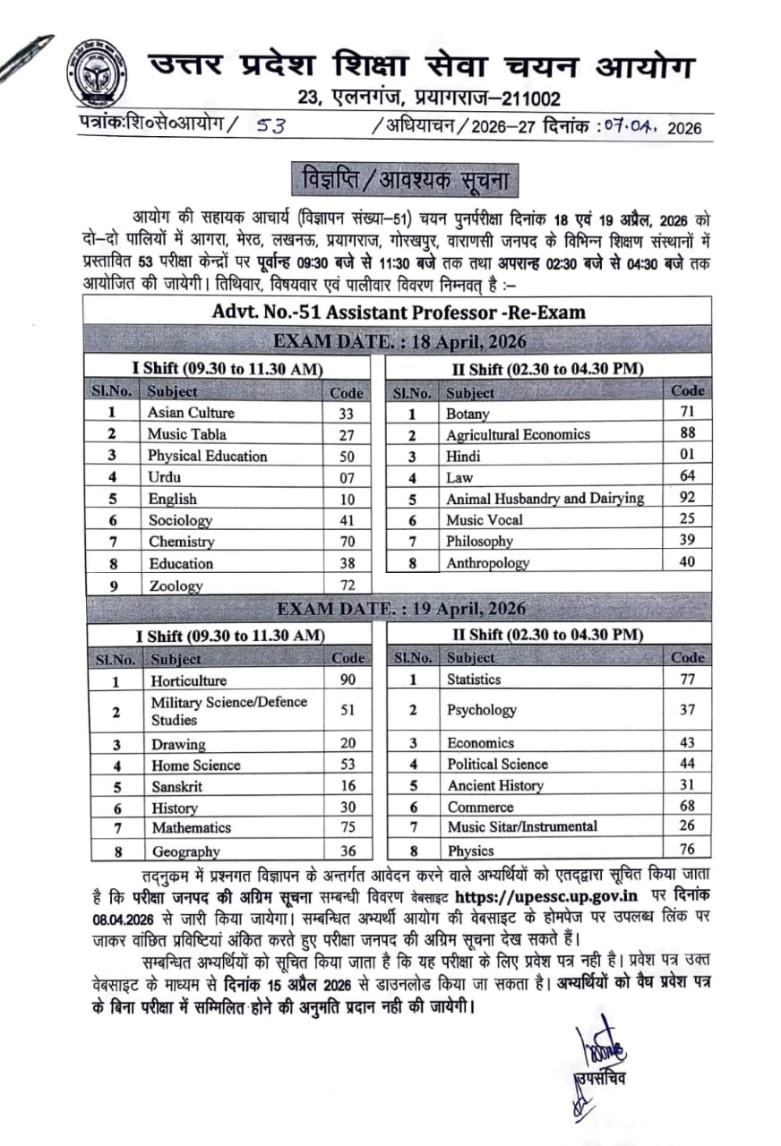 BREAKING:सहायक आचार्य भर्ती (विज्ञापन-51) पुनर्परीक्षा का ऐलान: 18-19 अप्रैल को दो पालियों में होगी परीक्षा, 6 शहरों में 53 केंद्र तय!