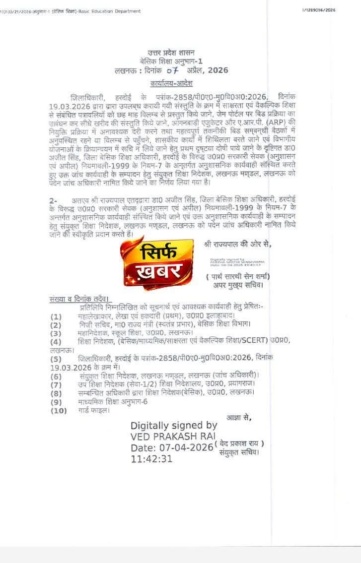 उत्तर प्रदेश शासन ने हरदोई के BSA पर सख्त रुख अपनाया है।