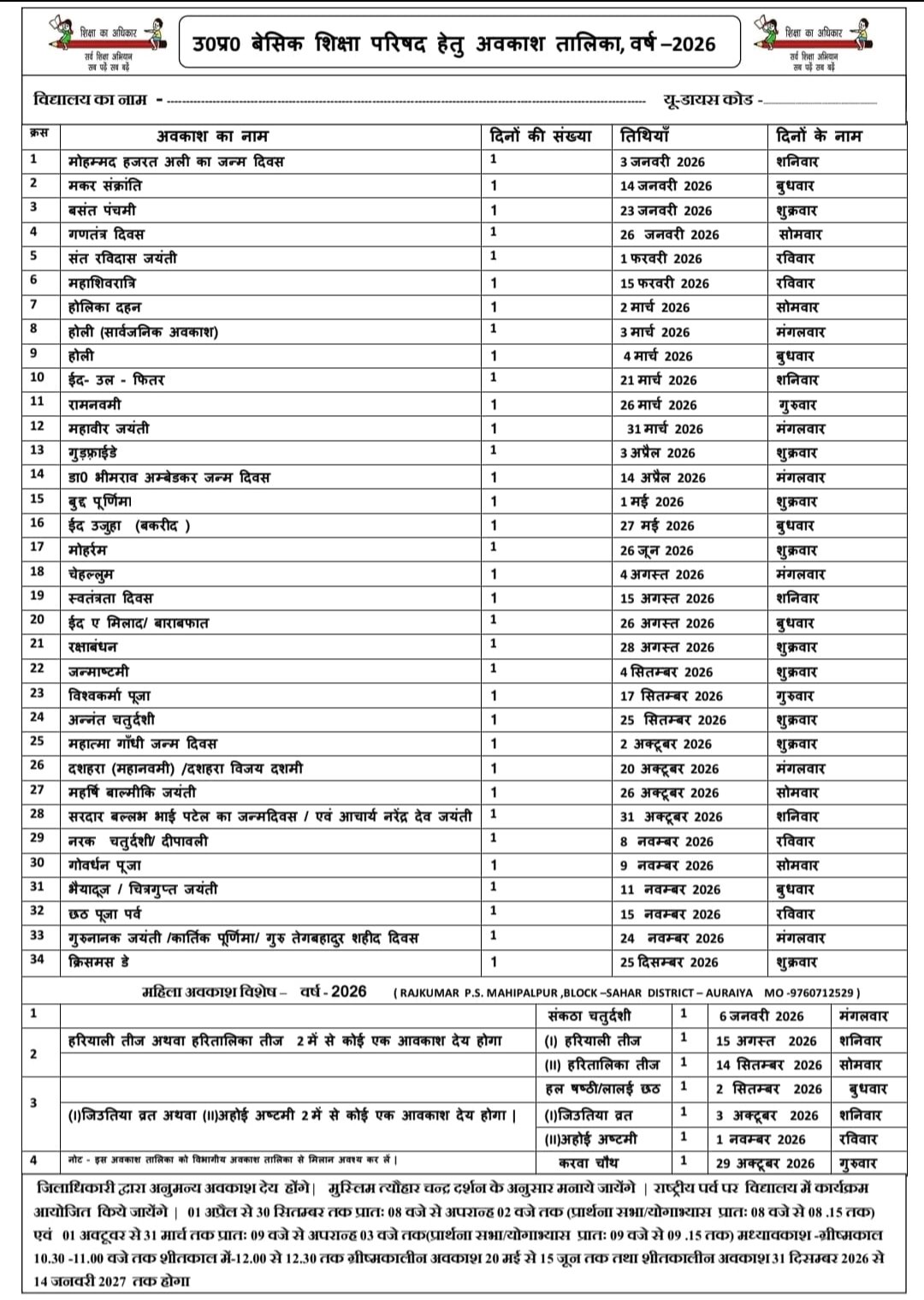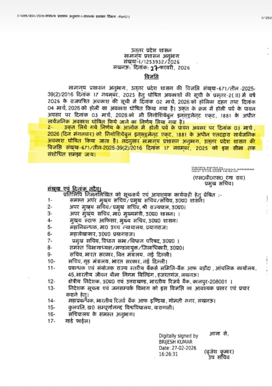 उत्तर प्रदेश शासन द्वारा दिनांक 03 मार्च 2026 को होली का सार्वजनिक अवकाश घोषित ऑफिशियल आदेश जारी February 27, 2026 by Ravi Singh उत्तर प्रदेश शासन द्वारा दिनांक 03 मार्च 2026 को होली का सार्वजनिक अवकाश घोषित ऑफिशियल आदेश जारी