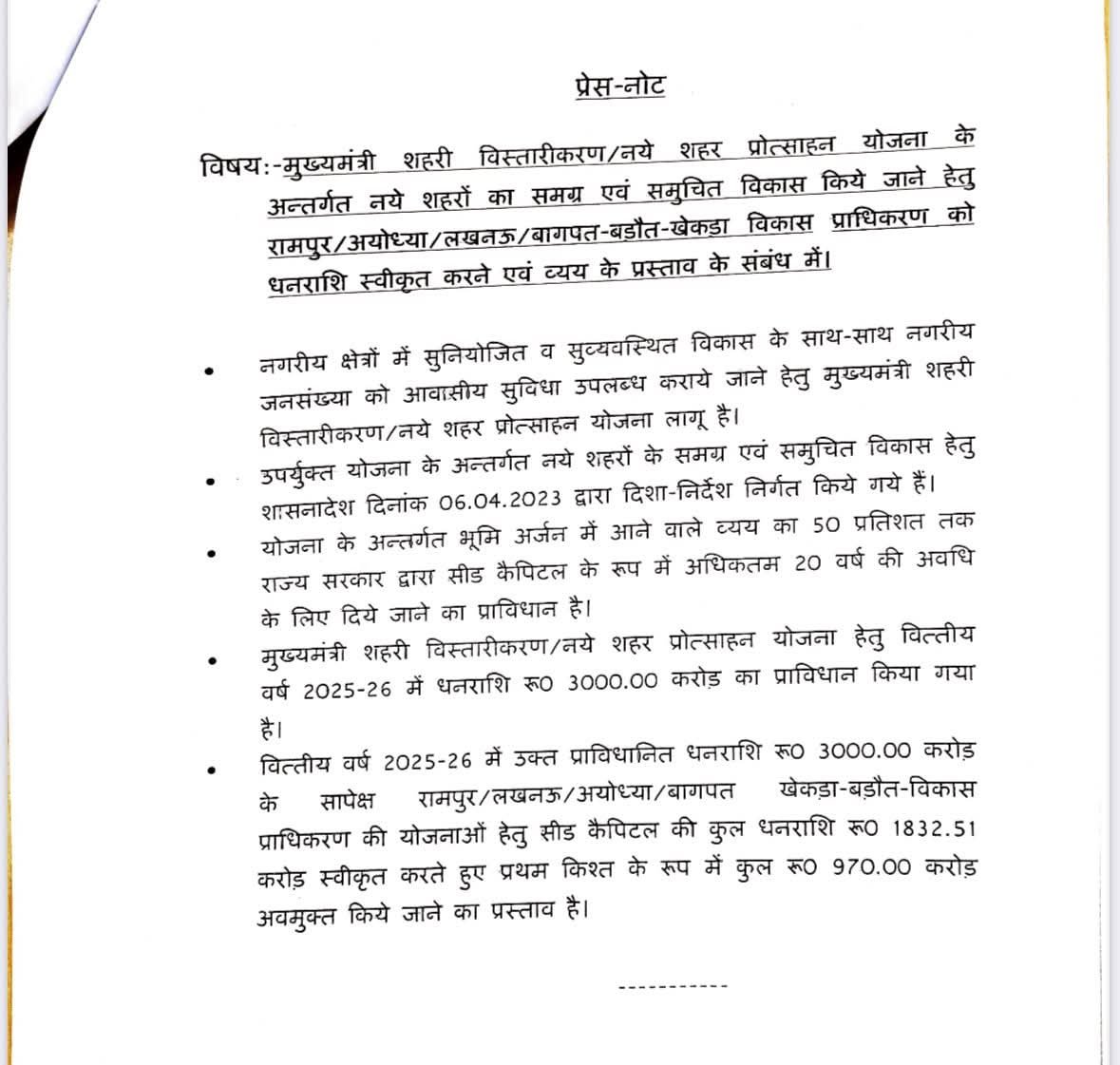 नए शहर प्रोत्साहन परियोजना के लिए धनराशि स्वीकृत!!