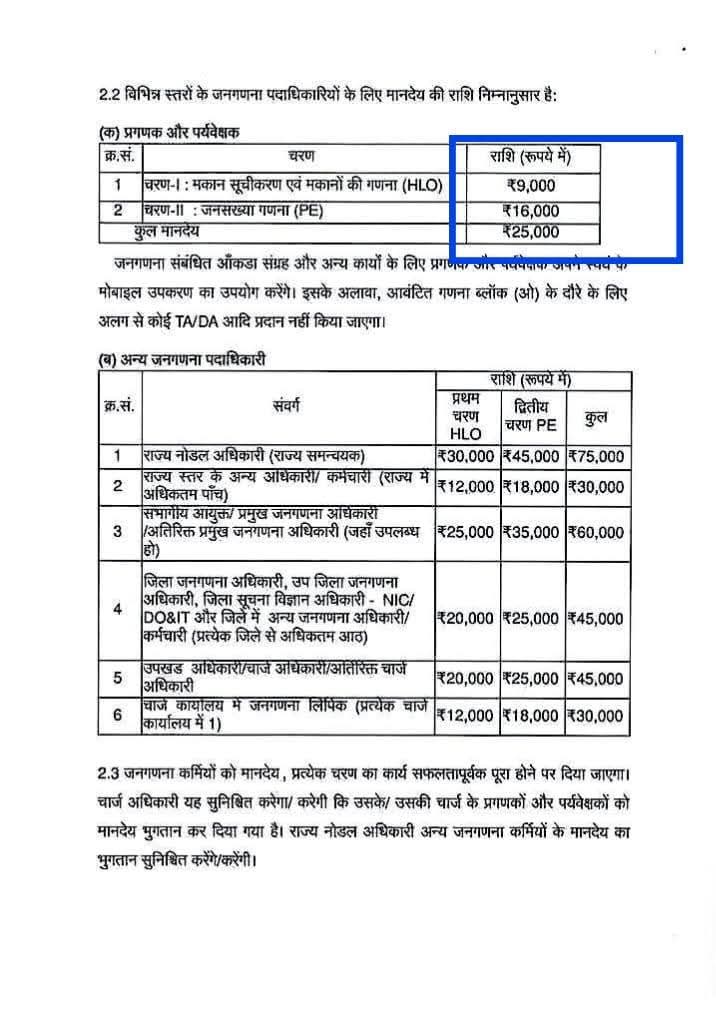 प्रथम चरण (मकान सूचीकरण व मकानों की गणना) का मानदेय 9000/- रुपए व द्वितीय चरण (जनसंख्या गणना) का मानदेय 16000/- रुपए रहेगा।