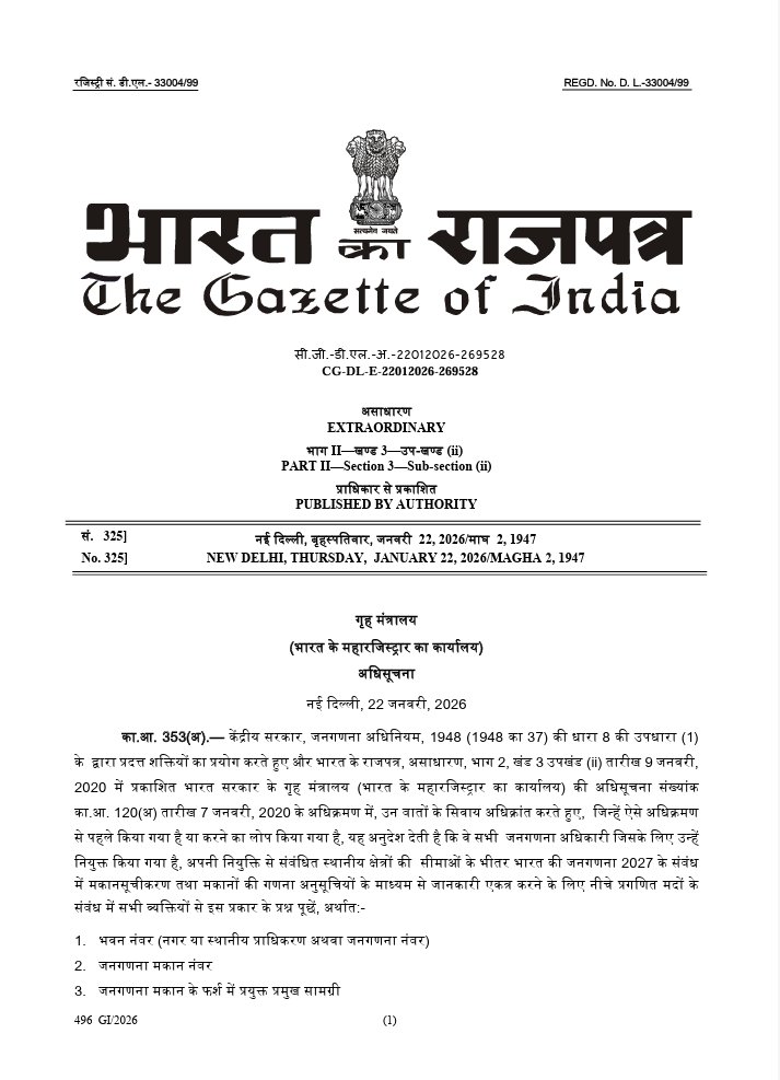 भारत की जनगणना 2027 के प्रथम चरण – मकानसूचीकरण और मकानों की गणना हेतु प्रश्नावली की अधिसूचना जारी। द्वितीय चरण अर्थात जनसंख्या गणना की प्रश्नावली यथासमय अधिसूचित की जाएगी।