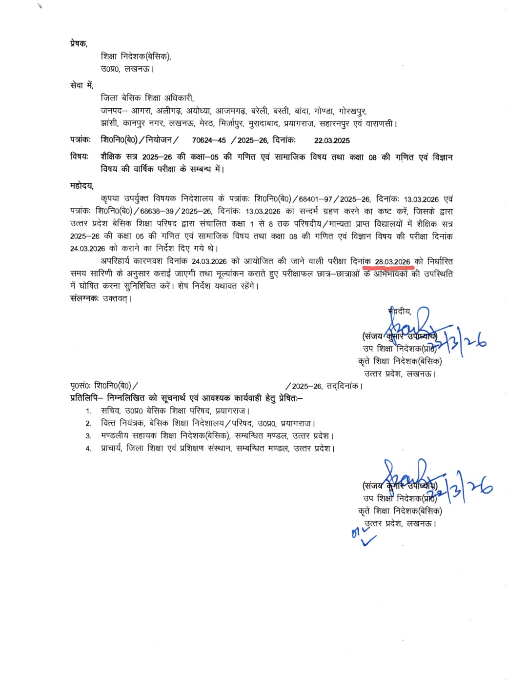 कृपया उपर्युक्त विषयक निदेशालय के पत्रांकः शि०नि० (बे०)/68401-97/2025-26, दिनांकः 13.03.2026 एवं पत्रांकः शि०नि० (बे०)/68638-39/2025-26, दिनांकः 13.03.2026 का सन्दर्भ ग्रहण करने का कष्ट करें, जिसके द्वारा उत्तर प्रदेश बेसिक शिक्षा परिषद द्वारा संचालित कक्षा 1 से 8 तक परिषदीय/मान्यता प्राप्त विद्यालयों में शैक्षिक सत्र 2025-26 की कक्षा 05 की गणित एवं सामाजिक विषय तथा कक्षा 08 की गणित एवं विज्ञान विषय की परीक्षा दिनांक 24.03.2026 को कराने का निर्देश दिए गये थे।