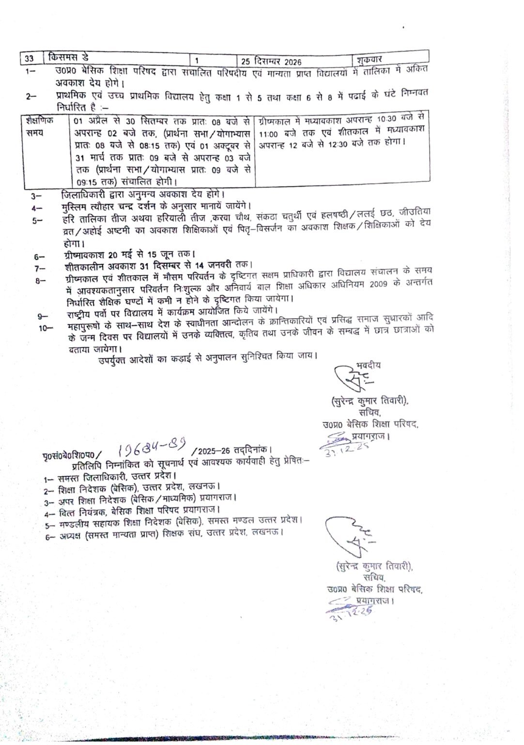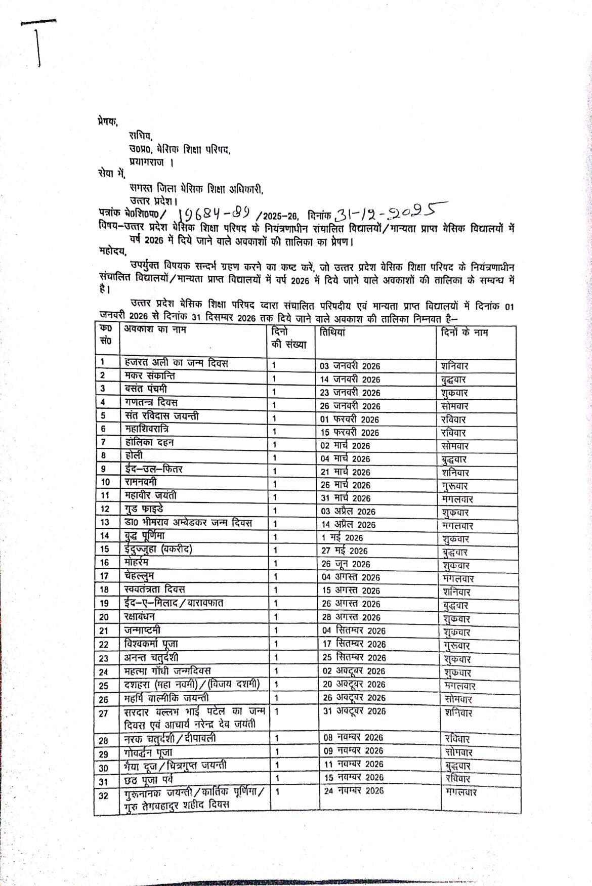 उत्तर प्रदेश बेसिक शिक्षा परिषद के नियंत्रणाधीन संचालित विद्यालयों / मान्यता प्राप्त बेसिक विद्यालयों में वर्ष 2026 में दिये जाने वाले अवकाशों की तालिका का प्रेषण।