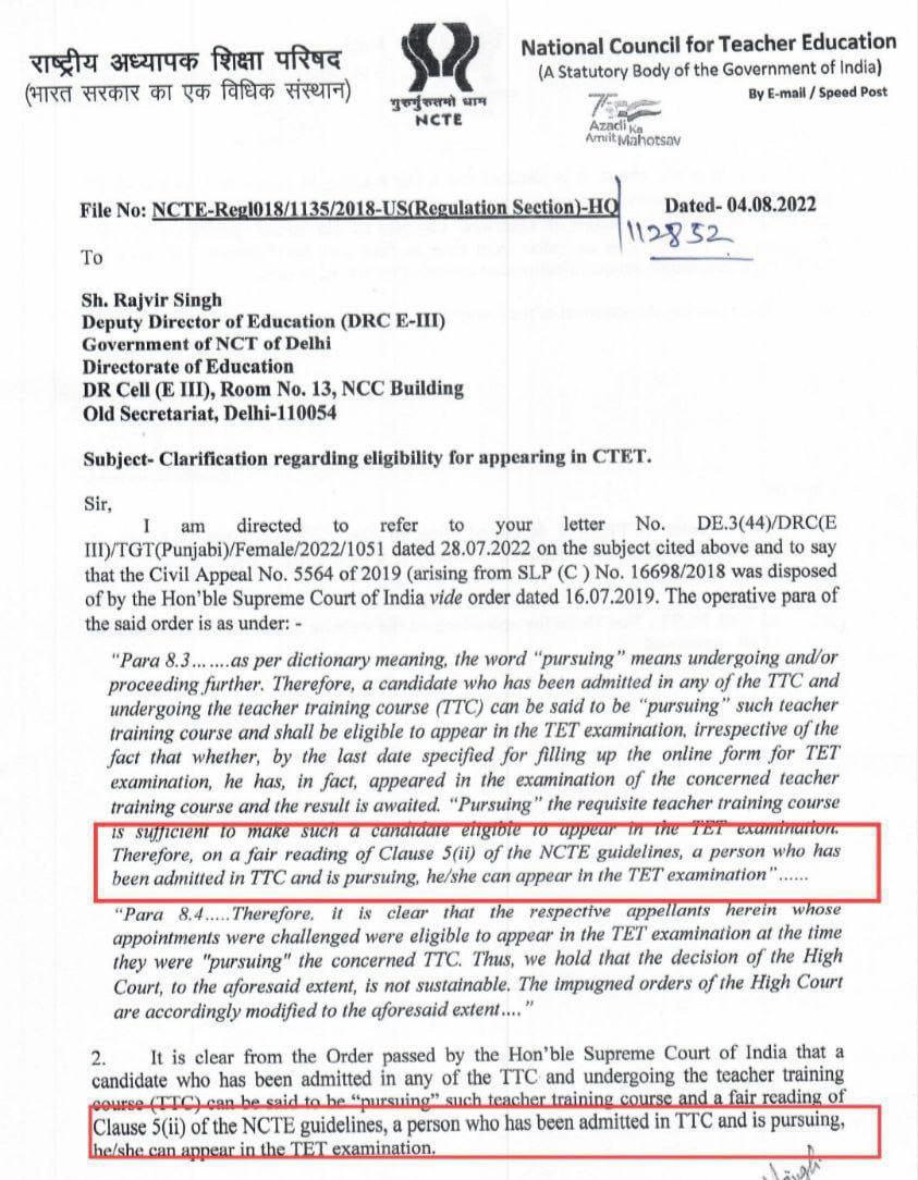CTET से संबंधित एक प्रश्न था कि क्या हम 1st ईयर या सेमेस्टर में है मान्य होगा या नहीं? देखें NCTE का ऑफिसियल नोटिस