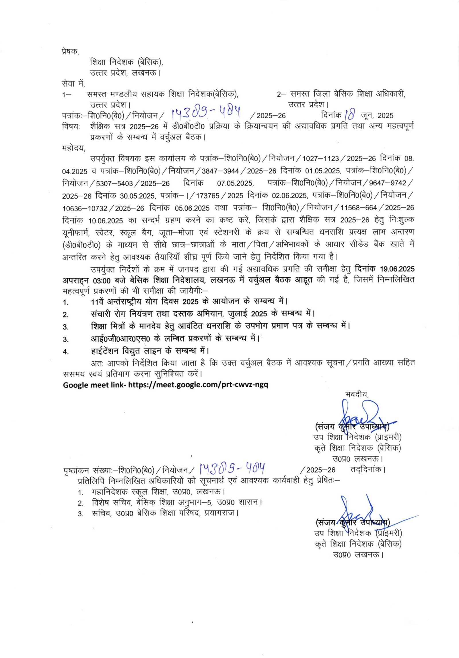 शैक्षिक सत्र 2025-26 में डी०बी०टी० प्रक्रिया के क्रियान्वयन की अद्यावधिक प्रगति तथा अन्य महत्वपूर्ण प्रकरणों के सम्बन्ध में वर्चुअल बैठक।