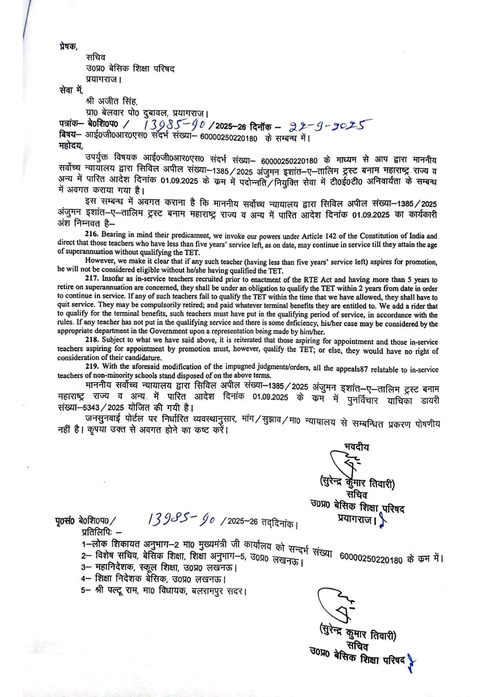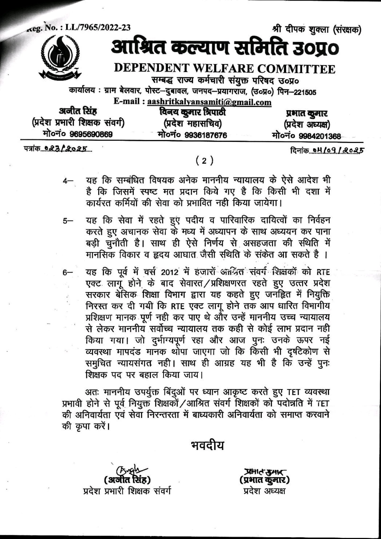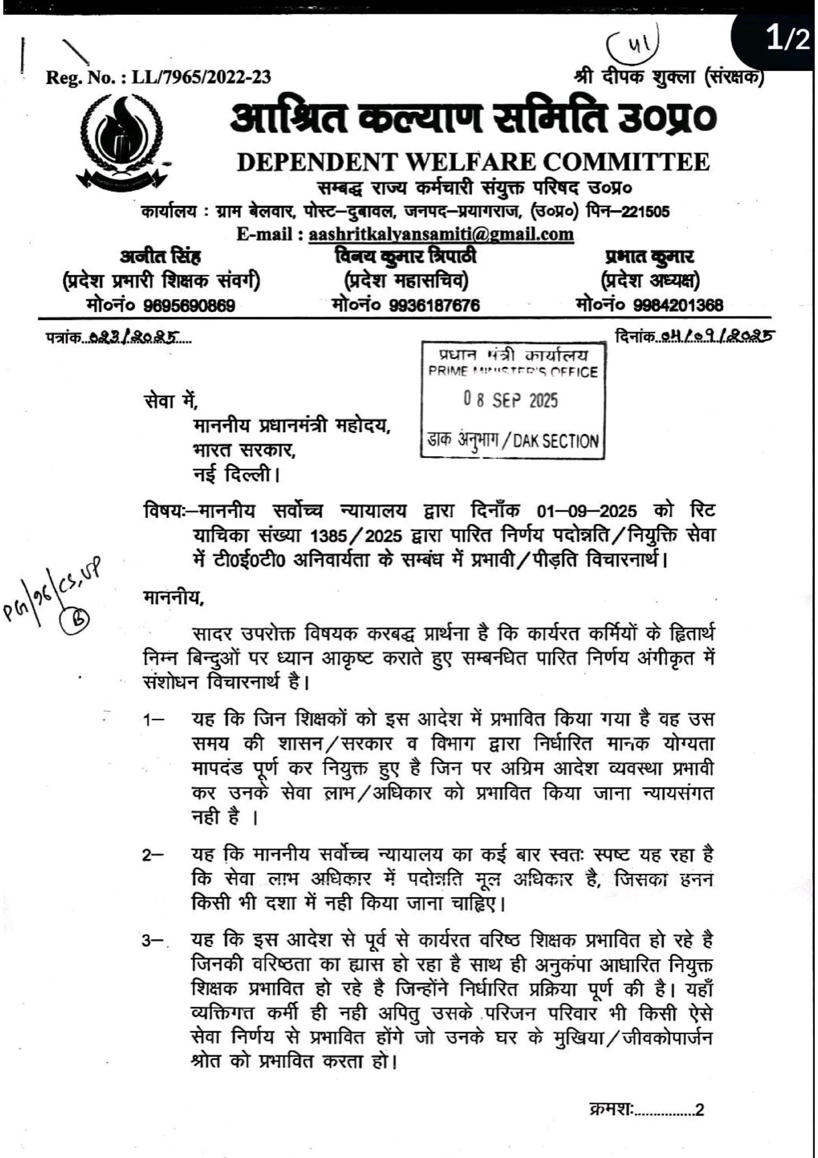 आश्रित कल्याण संघ द्वारा प्रेषित टेट प्रकरण अनुरोध पत्र पर सचिव बेसिक शिक्षा परिषद द्वारा पुनर्विचार याचिका स्वीकार्यता की गई प्रकरण में