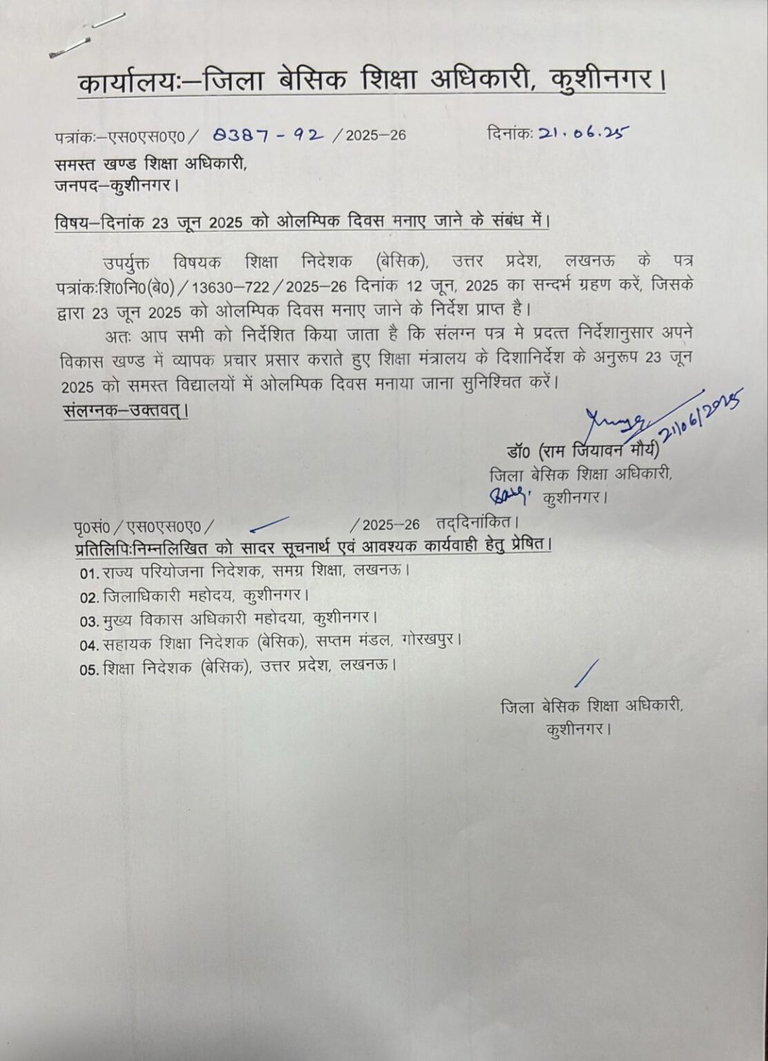 जनपद में 23 जून को ओलंपिक दिवस मनाने के संबंध में June 22, 2025 by Jaswant Singh जनपद में 23 जून को ओलंपिक दिवस मनाने के संबंध में
