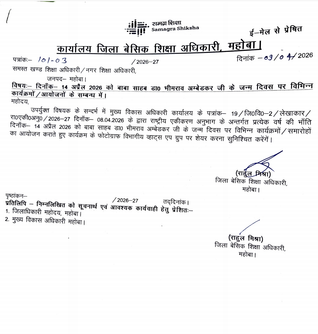 जनपद में दिनाँक 14 अप्रैल 2026 को बाबा साहब डा० भीमराव अम्बेडकर जी के जन्म दिवस पर विभिन्न कार्यक्रमों / आयोजनों के सम्बन्ध में April 13, 2026 by Ravi Singh जनपद में दिनाँक 14 अप्रैल 2026 को बाबा साहब डा० भीमराव अम्बेडकर जी के जन्म दिवस पर विभिन्न कार्यक्रमों / आयोजनों के सम्बन्ध में