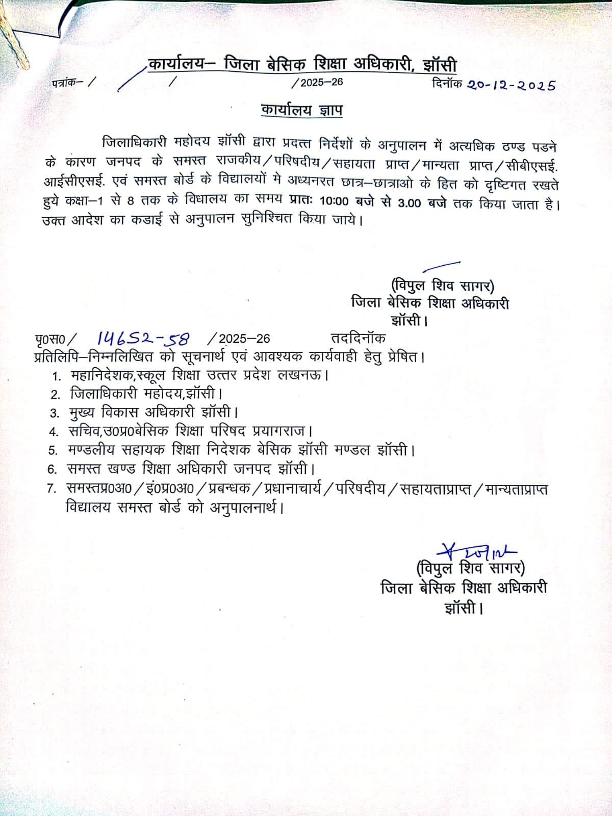 जिलाधिकारी ने सर्दी के सितम को देखते हुए स्कूलों के समय में परिवर्तन का दिया आदेश December 22, 2025 by Ravi Singh जिलाधिकारी ने सर्दी के सितम को देखते हुए स्कूलों के समय में परिवर्तन का दिया आदेश