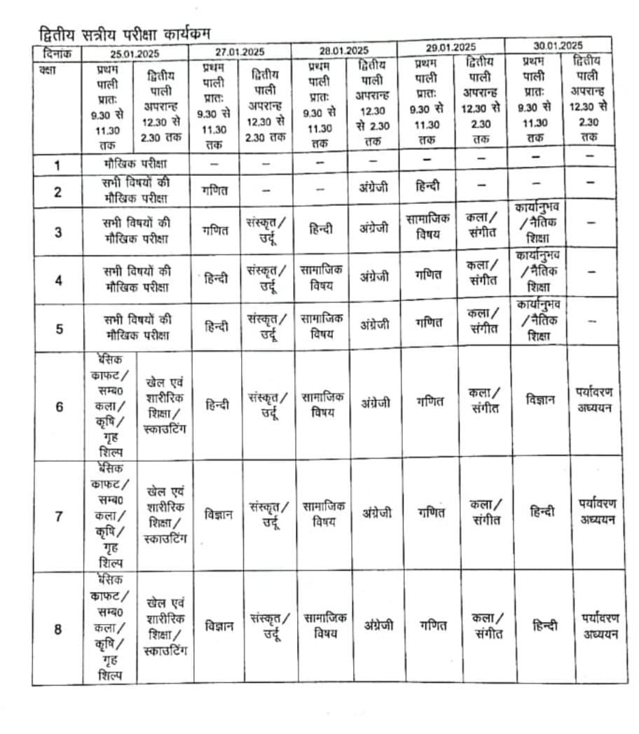 द्वितीय सत्रीय परीक्षा 2025 कार्यकम: कक्षा 01 से 08 तक के लिए January 29, 2025 by Jaswant Singh द्वितीय सत्रीय परीक्षा 2025 कार्यकम: कक्षा 01 से 08 तक के लिए