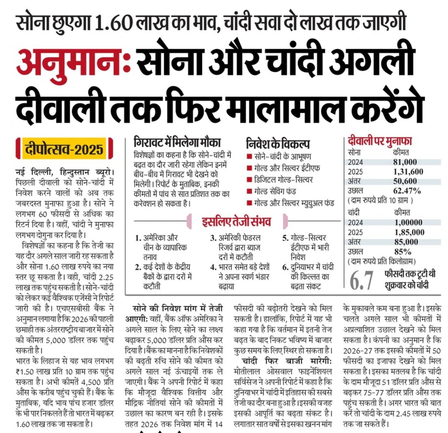 अनुमानः सोना और चांदी अगली दीवाली तक फिर मालामाल करेंगे, सोना छुएगा 1.60 लाख का भाव, चांदी सवा दो लाख तक जाएगी October 20, 2025 by Jaswant Singh अनुमानः सोना और चांदी अगली दीवाली तक फिर मालामाल करेंगे, सोना छुएगा 1.60 लाख का भाव, चांदी सवा दो लाख तक जाएगी