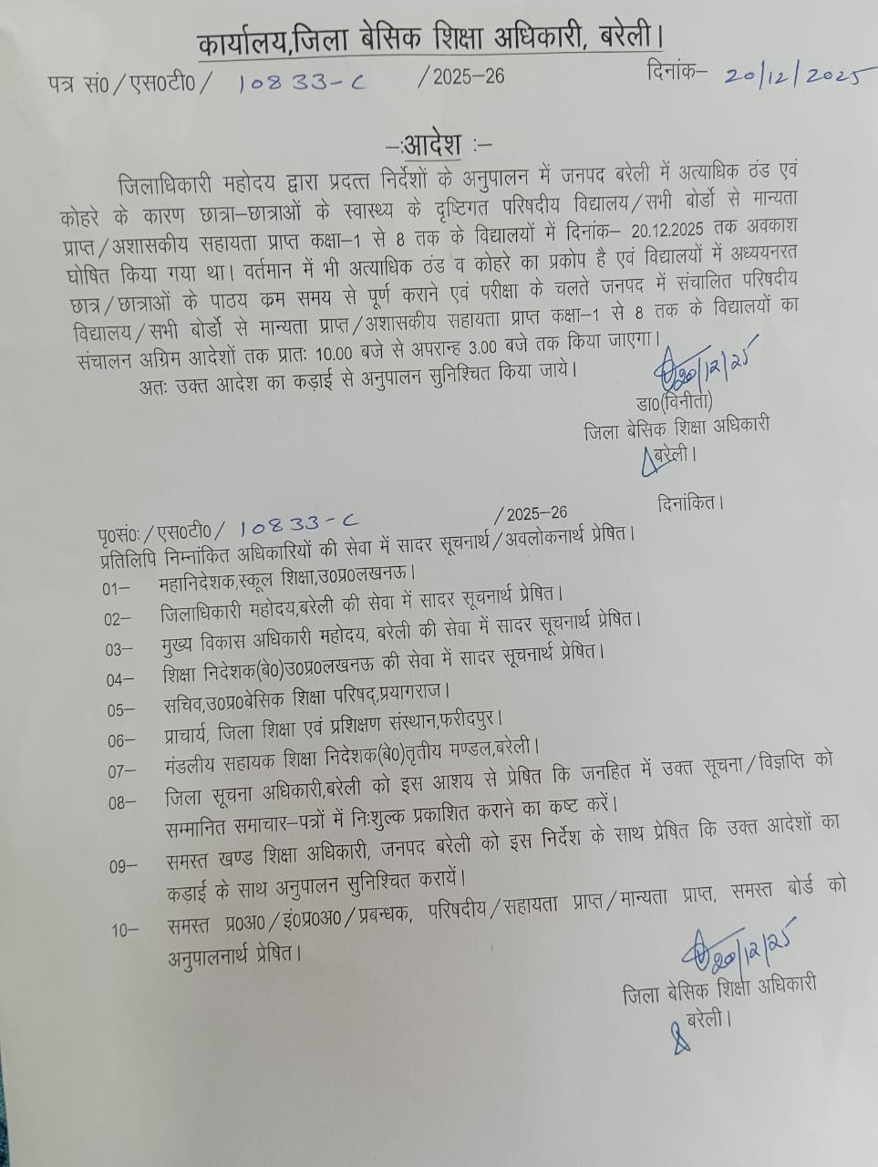 जिलाधिकारी महोदय द्वारा प्रदत्त निर्देशों के अनुपालन में जनपद बरेली में अत्याधिक ठंड एवं कोहरे के कारण छात्रा-छात्राओं के स्वास्थ्य के दृष्टिगत परिषदीय विद्यालय / सभी बोर्डो से मान्यता प्राप्त/अशासकीय सहायता प्राप्त कक्षा 1 से 8 तक के विद्यालयों में दिनांक- 20.12.2025 तक अवकाश घोषित किया गया था। वर्तमान में भी अत्याधिक ठंड व कोहरे का प्रकोप है एवं विद्यालयों में अध्ययनरत छात्र/छात्राओं के पाठ्य कम समय से पूर्ण कराने एवं परीक्षा के चलते जनपद में संचालित परिषदीय विद्यालय / सभी बोर्डो से मान्यता प्राप्त / अशासकीय सहायता प्राप्त कक्षा-1 से 8 तक के विद्यालयों का संचालन अग्रिम आदेशों तक प्रातः 10.00 बजे से अपरान्ह 3.00 बजे तक किया जाएगा।
