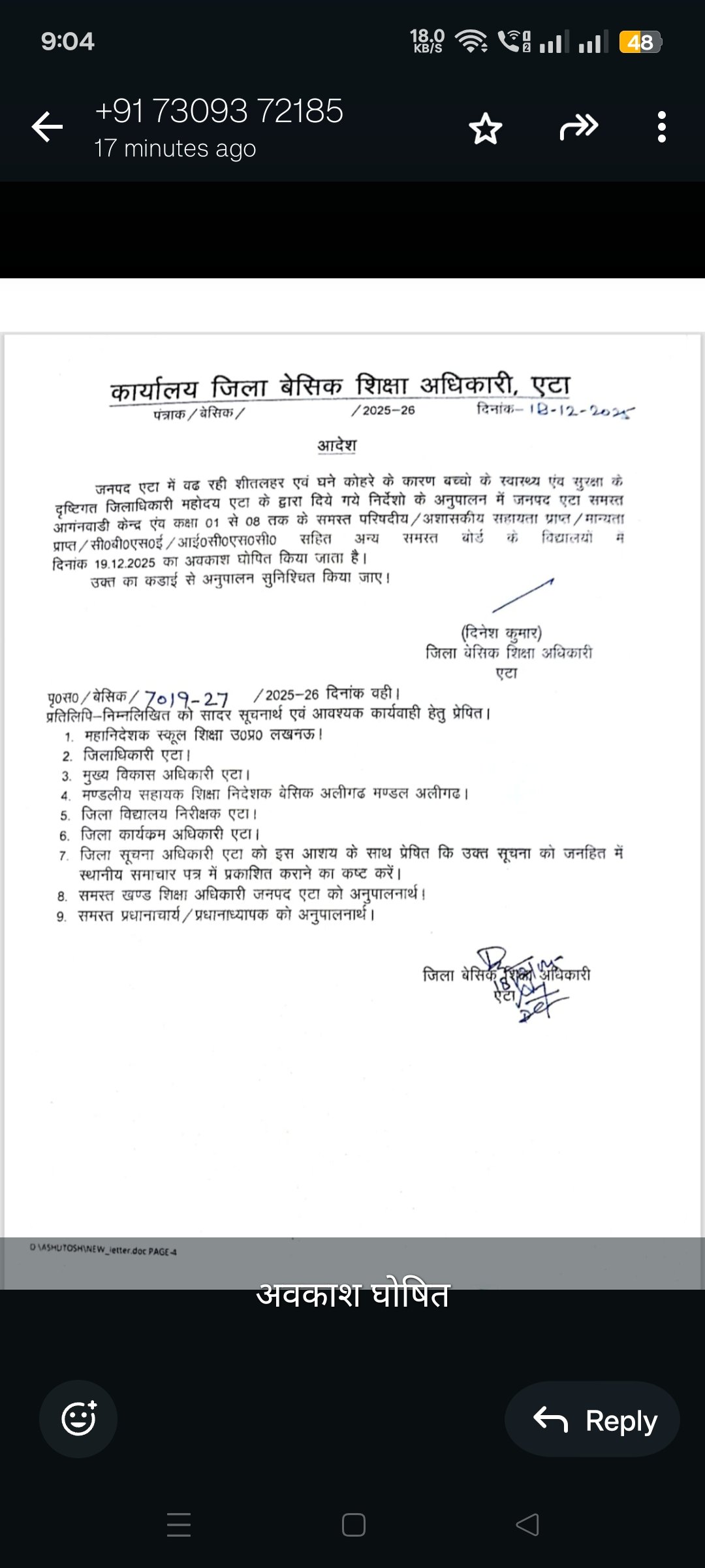 अत्यधिक शीतलहर एवं घने कोहरे के कारण अवकाश देखें आदेश December 18, 2025 by Ravi Singh अत्यधिक शीतलहर एवं घने कोहरे के कारण अवकाश देखें आदेश