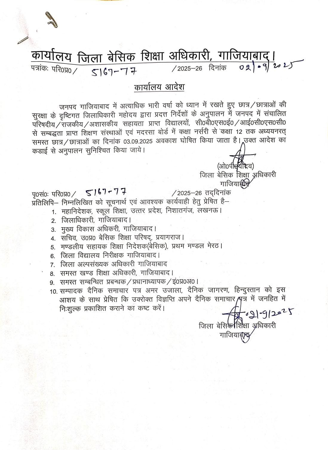जनपद में अत्यधिक भारी वर्षा के कारण 3 सितंबर का स्कूलों में अवकाश किया गया घोषित September 2, 2025 by Jaswant Singh जनपद में अत्यधिक भारी वर्षा के कारण 3 सितंबर का स्कूलों में अवकाश किया गया घोषित
