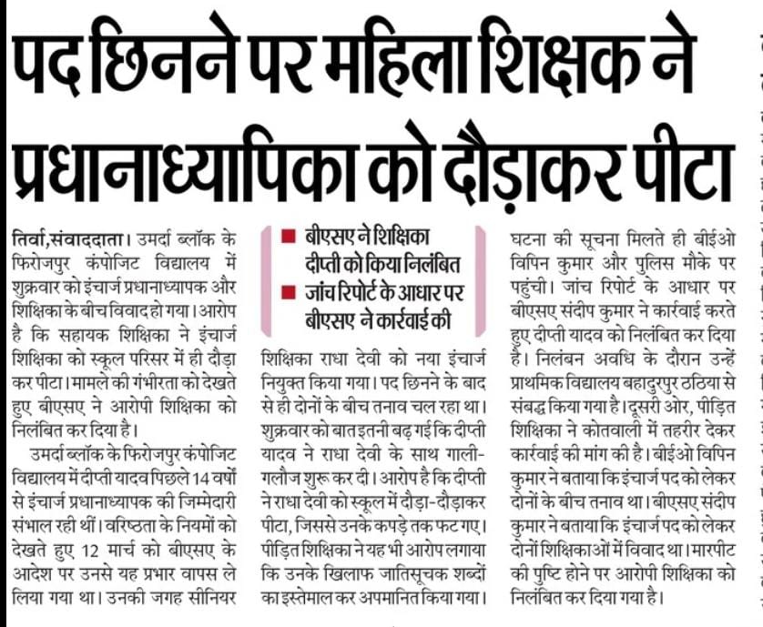 उमर्दा ब्लॉक के फिरोजपुर कंपोजिट विद्यालय में दीप्ती यादव पिछले 14 वर्षों से इंचार्ज प्रधानाध्यापक की जिम्मेदारी संभाल रही थीं। वरिष्ठता के नियमों को देखते हुए 12 मार्च को बीएसए के आदेश पर उनसे यह प्रभार वापस ले लिया गया था। उनकी जगह सीनियर