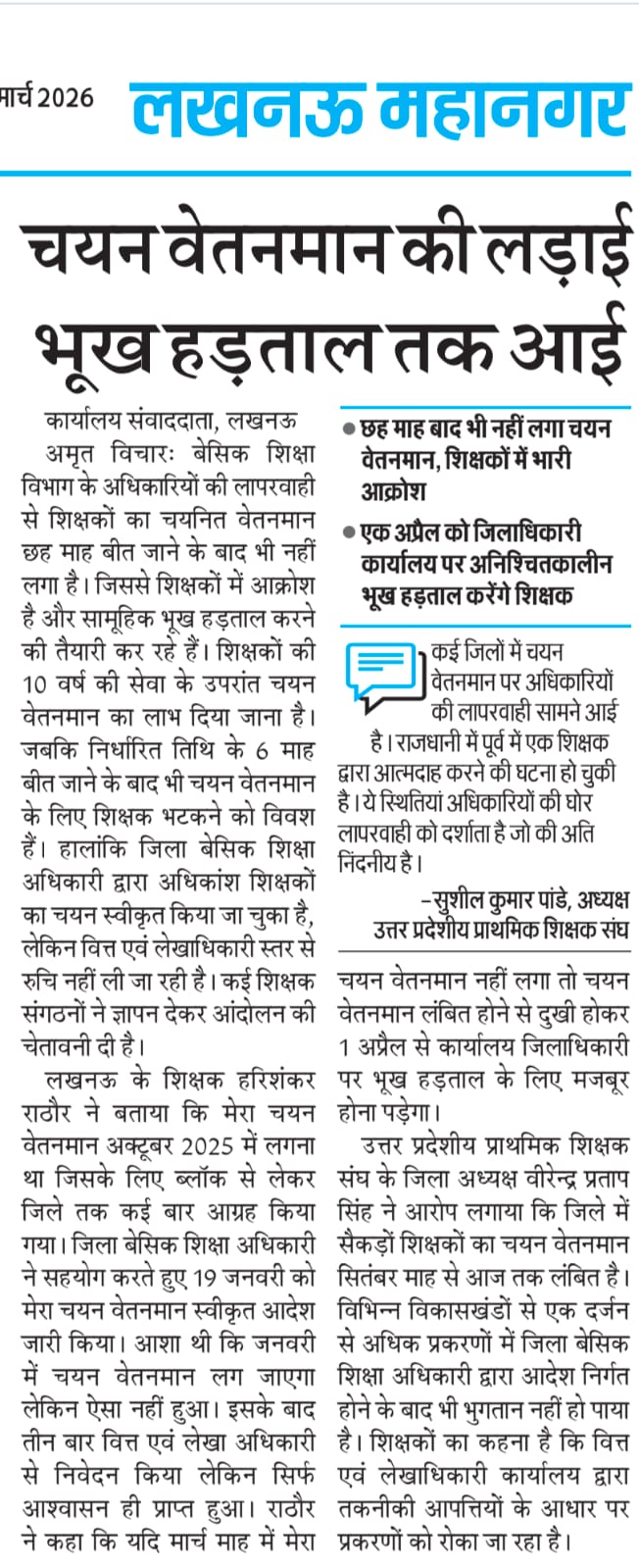 लखनऊ के शिक्षक हरिशंकर राठौर ने बताया कि मेरा चयन वेतनमान अक्टूबर 2025 में लगना था जिसके लिए ब्लॉक से लेकर जिले तक कई बार आग्रह किया गया। जिला बेसिक शिक्षा अधिकारी ने सहयोग करते हुए 19 जनवरी को मेरा चयन वेतनमान स्वीकृत आदेश जारी किया। आशा थी कि जनवरी में चयन वेतनमान लग जाएगा लेकिन ऐसा नहीं हुआ। इसके बाद तीन बार वित्त एवं लेखा अधिकारी से निवेदन किया लेकिन सिर्फ आश्वासन ही प्राप्त हुआ। राठौर ने कहा कि यदि मार्च माह में मेराचयन वेतनमान नहीं लगा तो चयन वेतनमान लंबित होने से दुखी होकर 1 अप्रैल से कार्यालय जिलाधिकारी पर भूख हड़ताल के लिए मजबूर होना पड़ेगा।