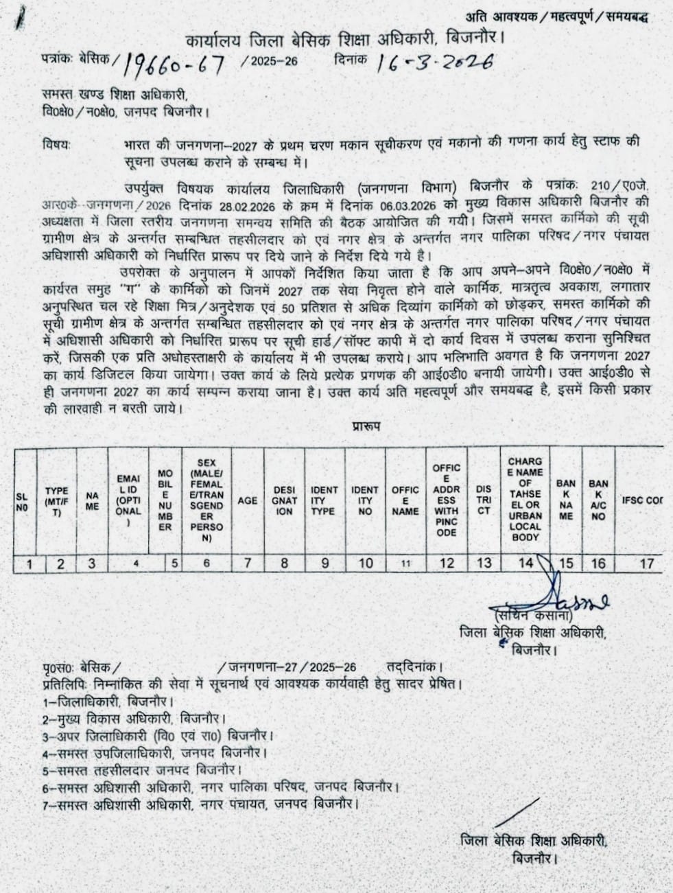 भारत की जनगणना-2027 के प्रथम चरण मकान सूचीकरण एवं मकानो की गणना कार्य हेतु स्टाफ की सूचना उपलब्ध कराने के सम्बन्ध में।