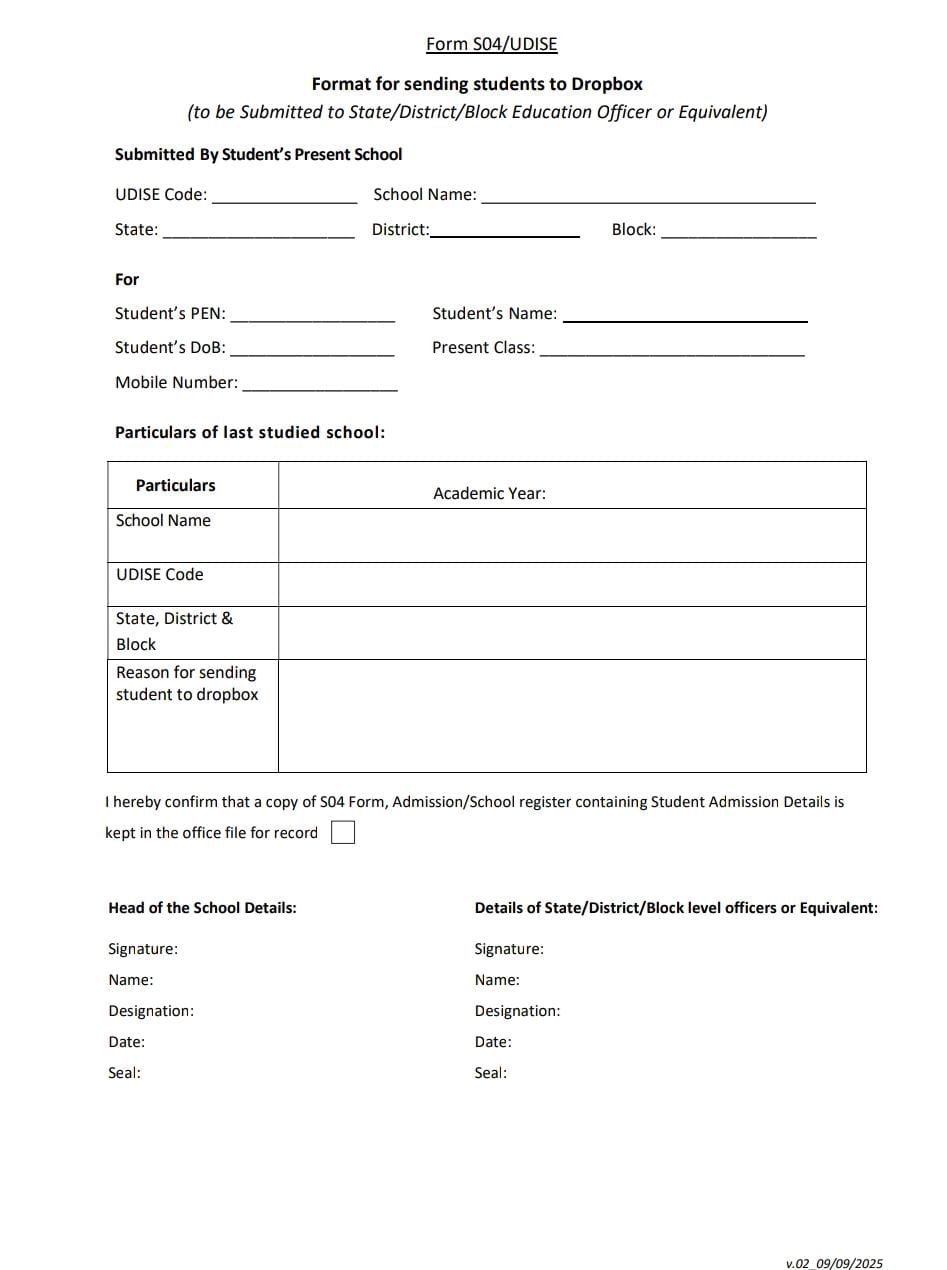 फॉर्म S04* / UDISE (छात्रों को ड्रॉपबॉक्स पर भेजने का प्रारूप)