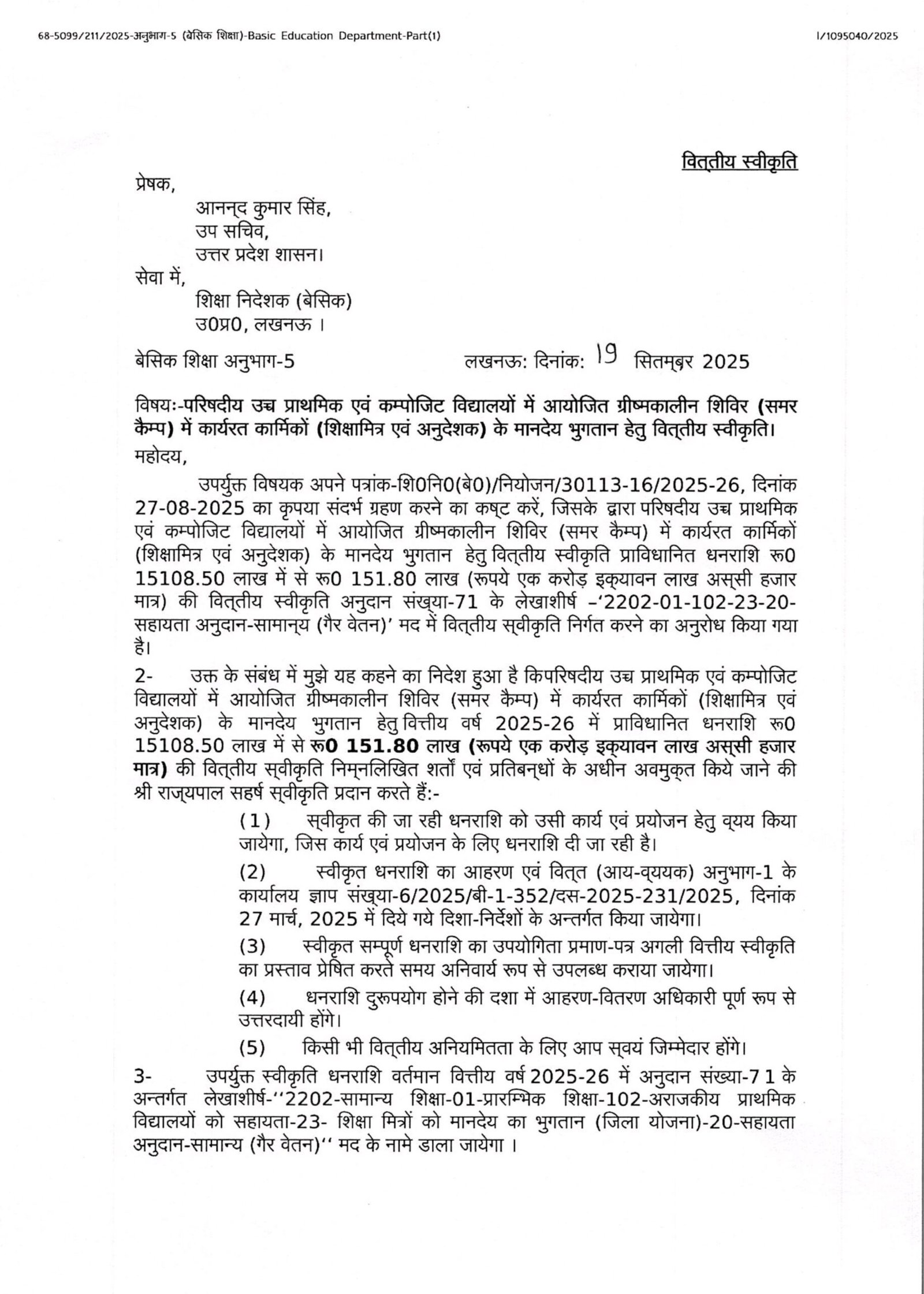 आयोजित ग्रीष्मकालीन शिविर में कार्यरत कार्मिकों (शिक्षामित्र एवं अनुदेशक) के मानदेय भुगतान हेतु वित्तीय स्वीकृति
