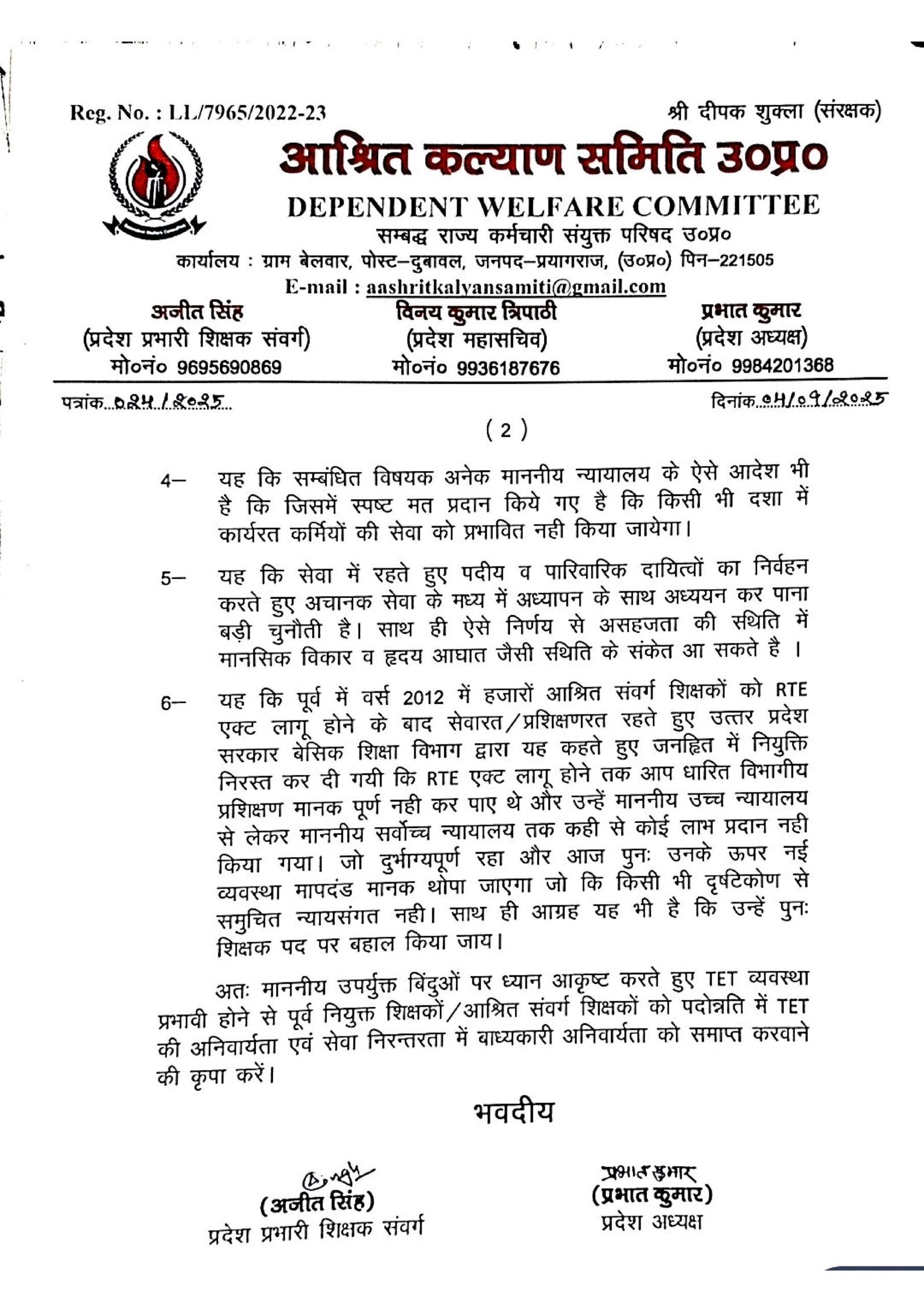 6-यह कि पूर्व में वर्स 2012 में हजारों आश्रित संवर्ग शिक्षकों को RTE एक्ट लागू होने के बाद सेवारत / प्रशिक्षणरत रहते हुए उत्तर प्रदेश सरकार बेसिक शिक्षा विभाग द्वारा यह कहते हुए जनहित में नियुक्ति निरस्त कर दी गयी कि RTE एक्ट लागू होने तक आप धारित विभागीय प्रशिक्षण मानक पूर्ण नहीं कर पाए थे और उन्हें माननीय उच्च न्यायालय से लेकर माननीय सर्वोच्च न्यायालय तक कही से कोई लाभ प्रदान नही किया गया। जो दुर्भाग्यपूर्ण रहा और आज पुनः उनके ऊपर नई व्यवस्था मापदंड मानक थोपा जाएगा जो कि किसी भी दृष्टकोण से समुचित न्यायसंगत नही। साथ ही आग्रह यह भी है कि उन्हें पुनः शिक्षक पद पर बहाल किया जाय।