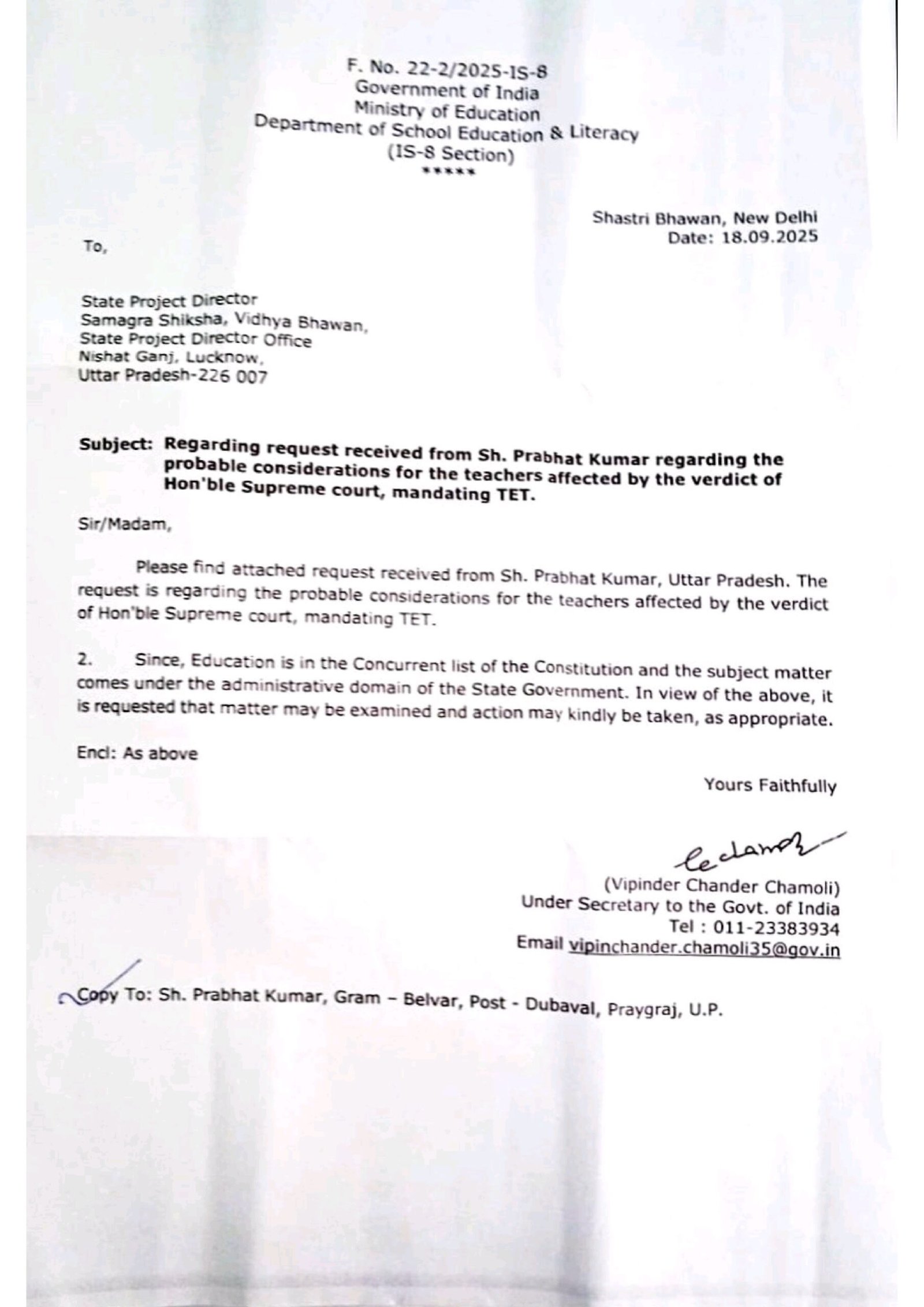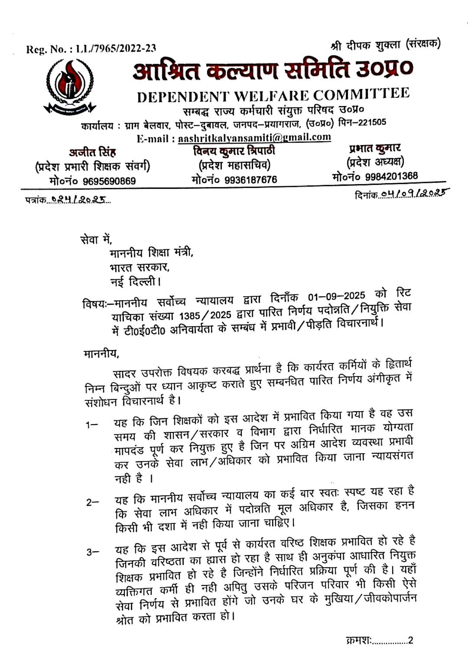 आश्रित कल्याण संघ के अनुरोध पर टेट प्रकरण में पुनः बड़ी खबर माननीय केंद्रीय शिक्षा मंत्री को प्रेषित पत्र को संज्ञान में लेकर की गई कार्यवाही