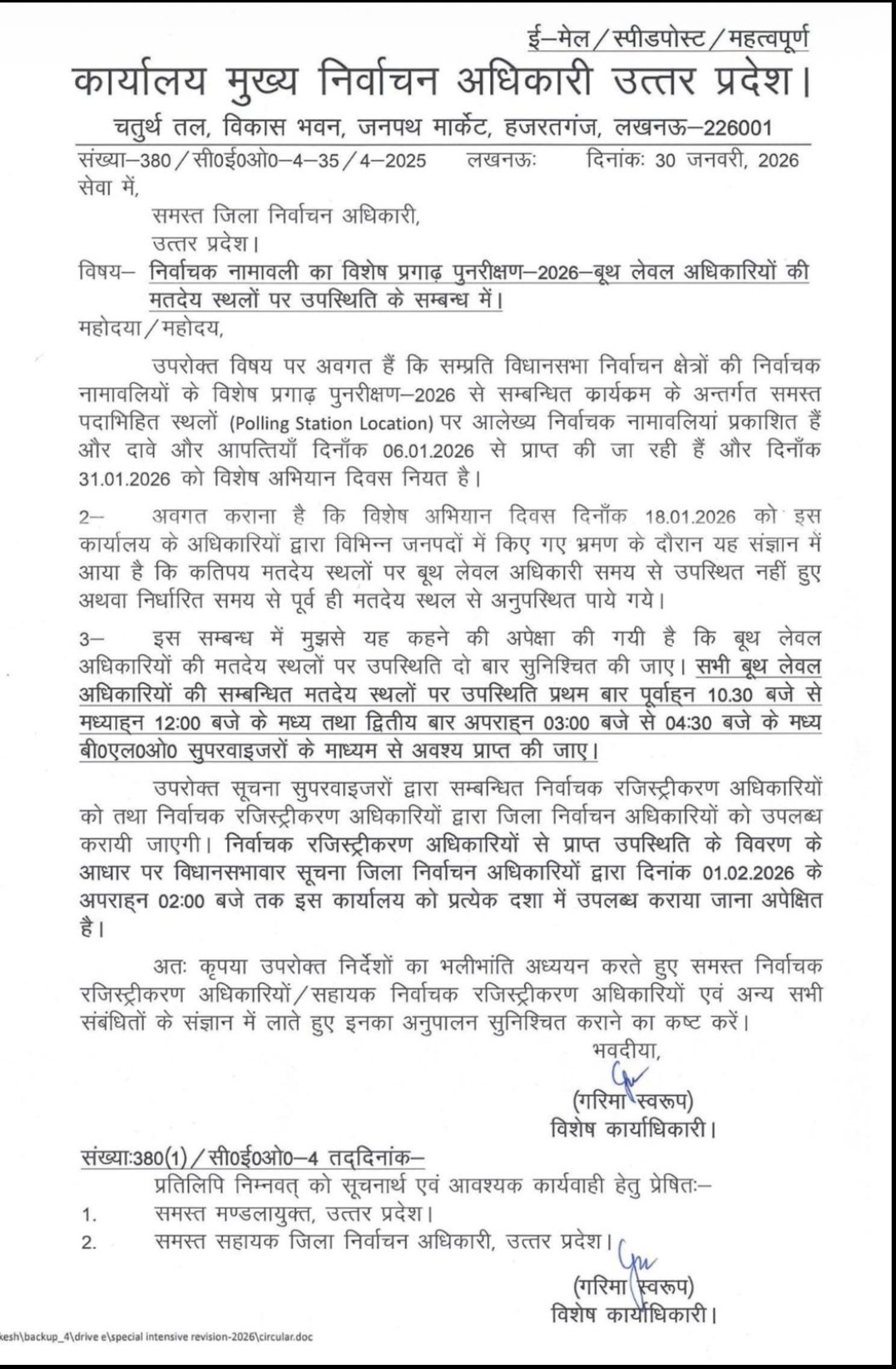 BLO के लिए अहम आधिकारिक निर्देश बीएलओ शनिवार दिनांक 31 जनवरी 2026 को अपने बूथ पर सुबह 10 बजे से सायंकाल 5 बजे तक अनिवार्य रूप से उपस्थित रहेंगे, दो बार हाजिरी चैक करेंगे