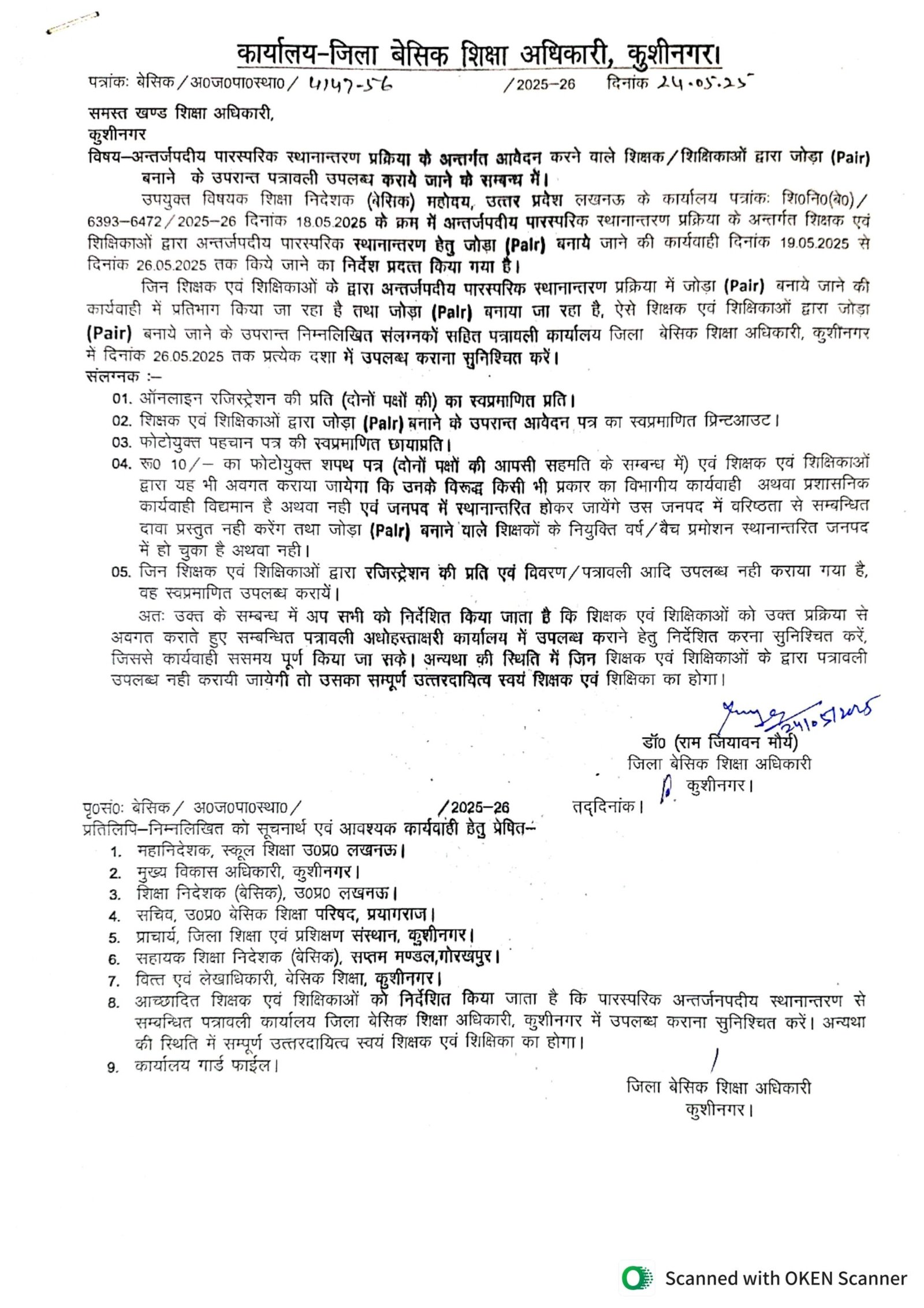 जिन शिक्षक एवं शिक्षिकाओं के द्वारा अन्तर्जपदीय पारस्परिक स्थानान्तरण प्रक्रिया में जोड़ा (Pair) बनाये जाने की कार्यवाही में प्रतिभाग किया जा रहा है तथा जोड़ा (Palr) बनाया जा रहा है, ऐसे शिक्षक एवं शिक्षिकाओं द्वारा जोड़ा (Pair) बनाये जाने के उपरान्त निम्नलिखित संलग्नकों सहित पत्रायली कार्यालय जिला बेसिक शिक्षा अधिकारी, कुशीनगर में दिनांक 26.05.2025 तक प्रत्येक दशा में उपलब्ध कराना सुनिश्चित करें।