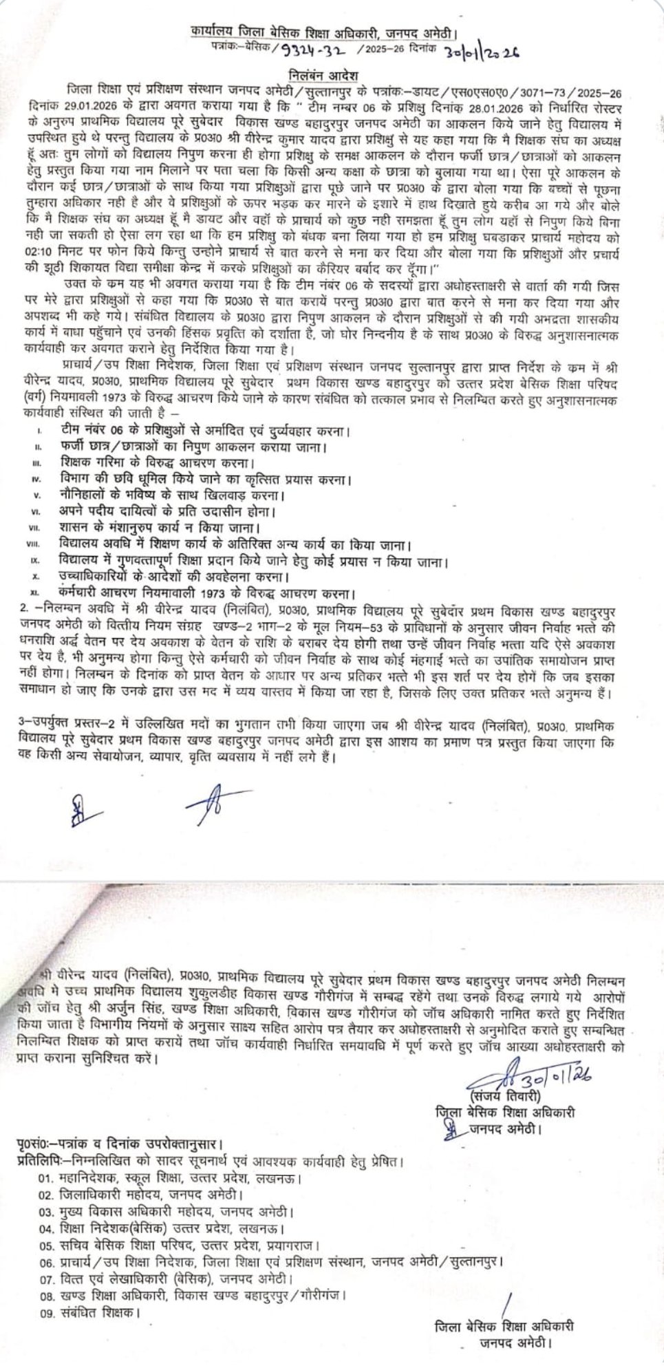 निपुण आकलन में अनियमितता पर बड़ी कार्रवाई: अवैध वसूली व लापरवाही के आरोप में शिक्षक निलंबित, जांच के आदेश January 31, 2026 by Ravi Singh निपुण आकलन में अनियमितता पर बड़ी कार्रवाई: अवैध वसूली व लापरवाही के आरोप में शिक्षक निलंबित, जांच के आदेश
