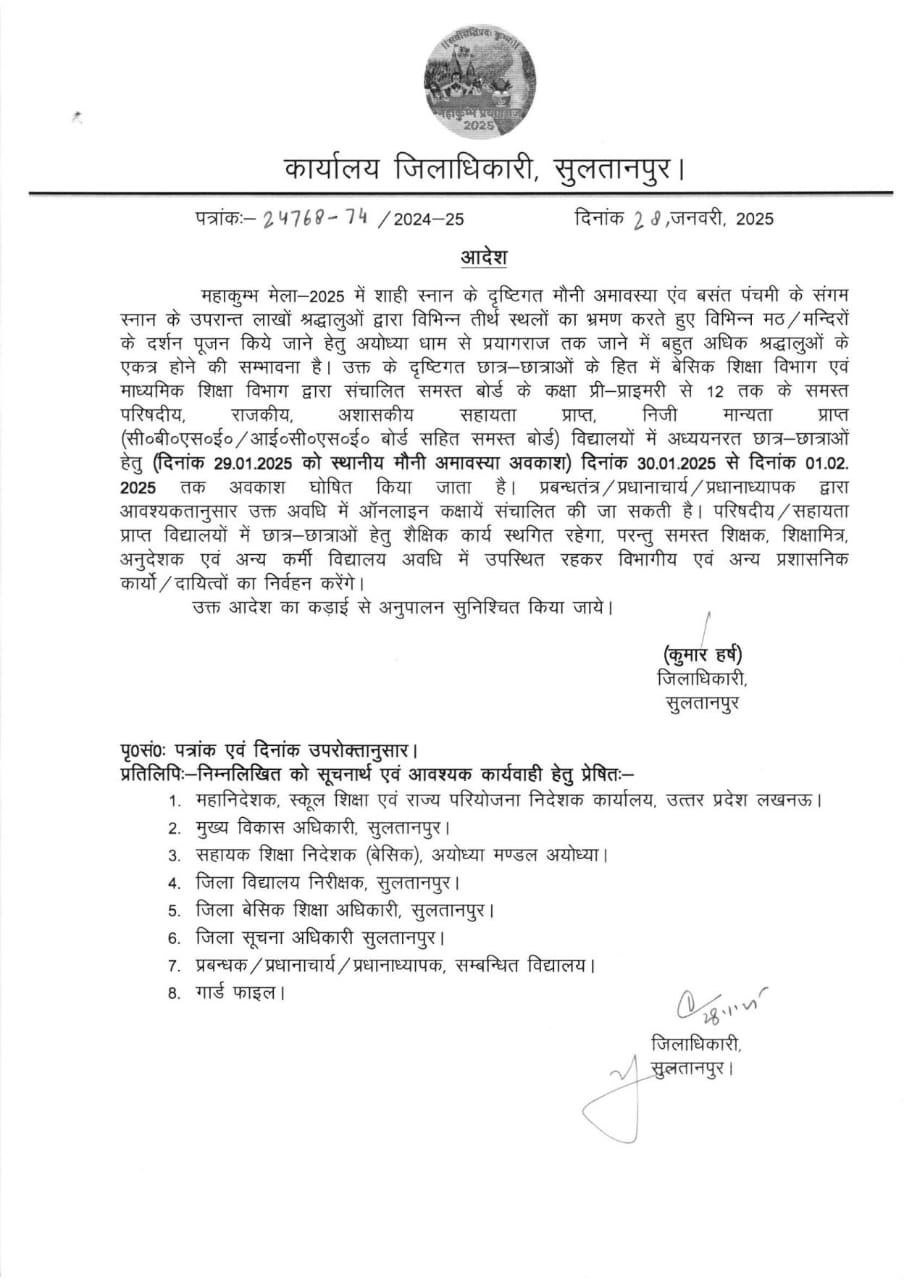 जनपद में 29 जनवरी को मौनी अमावस्या के उपलक्ष्य में एवं 30 से 01 जनवरी तक अवकाश घोषित किए जाने के सम्बन्ध में January 28, 2025 by Jaswant Singh जनपद में 29 जनवरी को मौनी अमावस्या के उपलक्ष्य में एवं 30 से 01 जनवरी तक अवकाश घोषित किए जाने के सम्बन्ध में